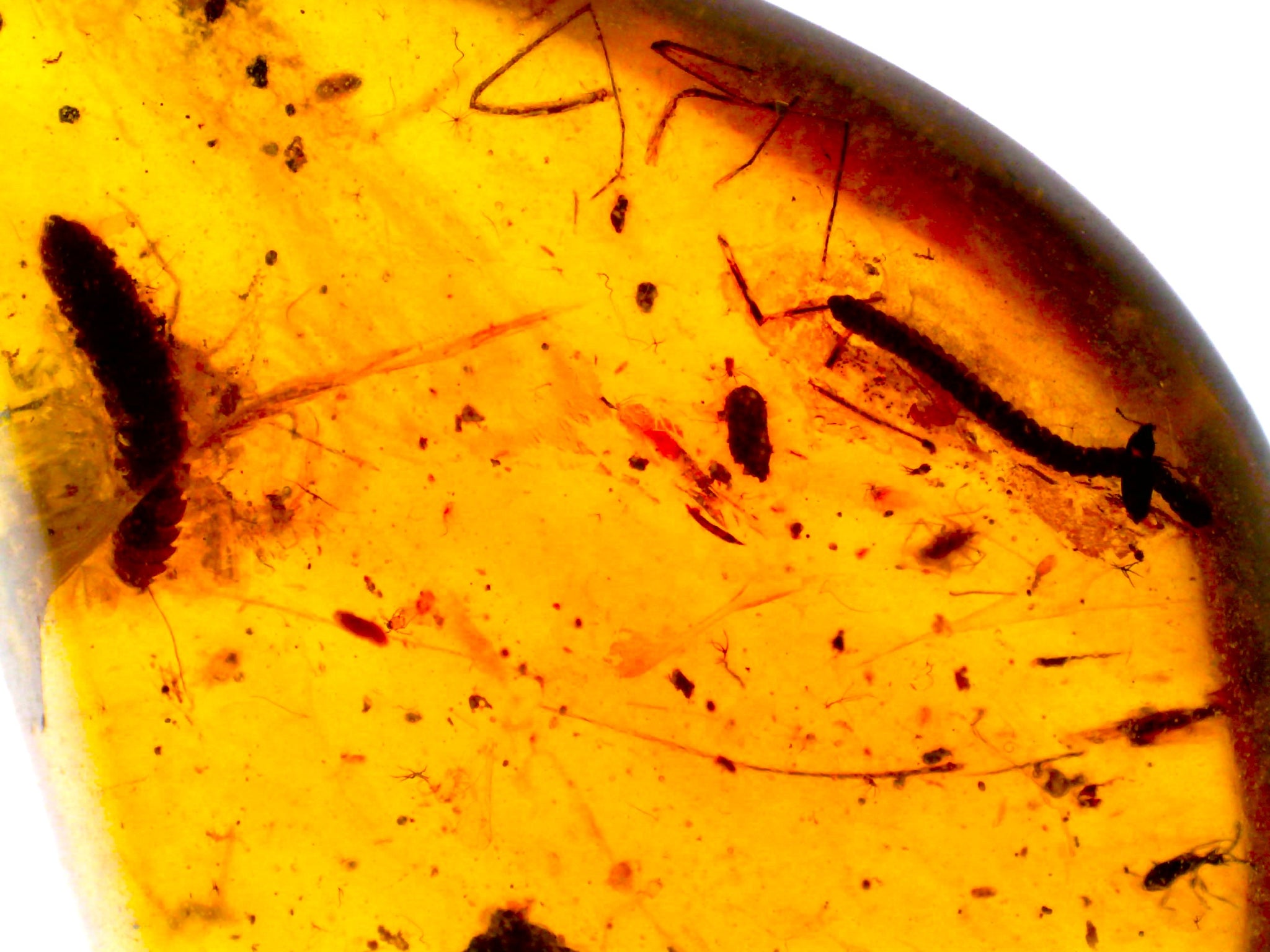 Amber is petrified tree resin (not sap, resin is much thicker). It forms when trees secrete resin, and the resin is quickly washed away by water and deposited in a lake where it is covered by sediment (if the resin isn’t washed away it decomposes or gets eaten). Along the way, small particles of dust, bits of plant material, and even small animals like insects and lizards can become trapped in the resin which hardens and preserves whatever is trapped within (aka inclusions). Myanmar amber, also known as Burmite, is world renowned gem quality amber known for excellent inclusions of insects, plants, and even small vertebrates! The preservation in amber can be so good it inspired a major portion of Jurassic Park, where blood sucking insects trapped in amber provided the DNA needed to clone dinosaurs! While the science of cloning dinosaurs from amber is, for better or worse, not a reality the pristine fossils of small animals that are rarely fossilized in any other way is very real! Makes for a terrific addition to any fossil collection or even a gem for high end jewelry!
