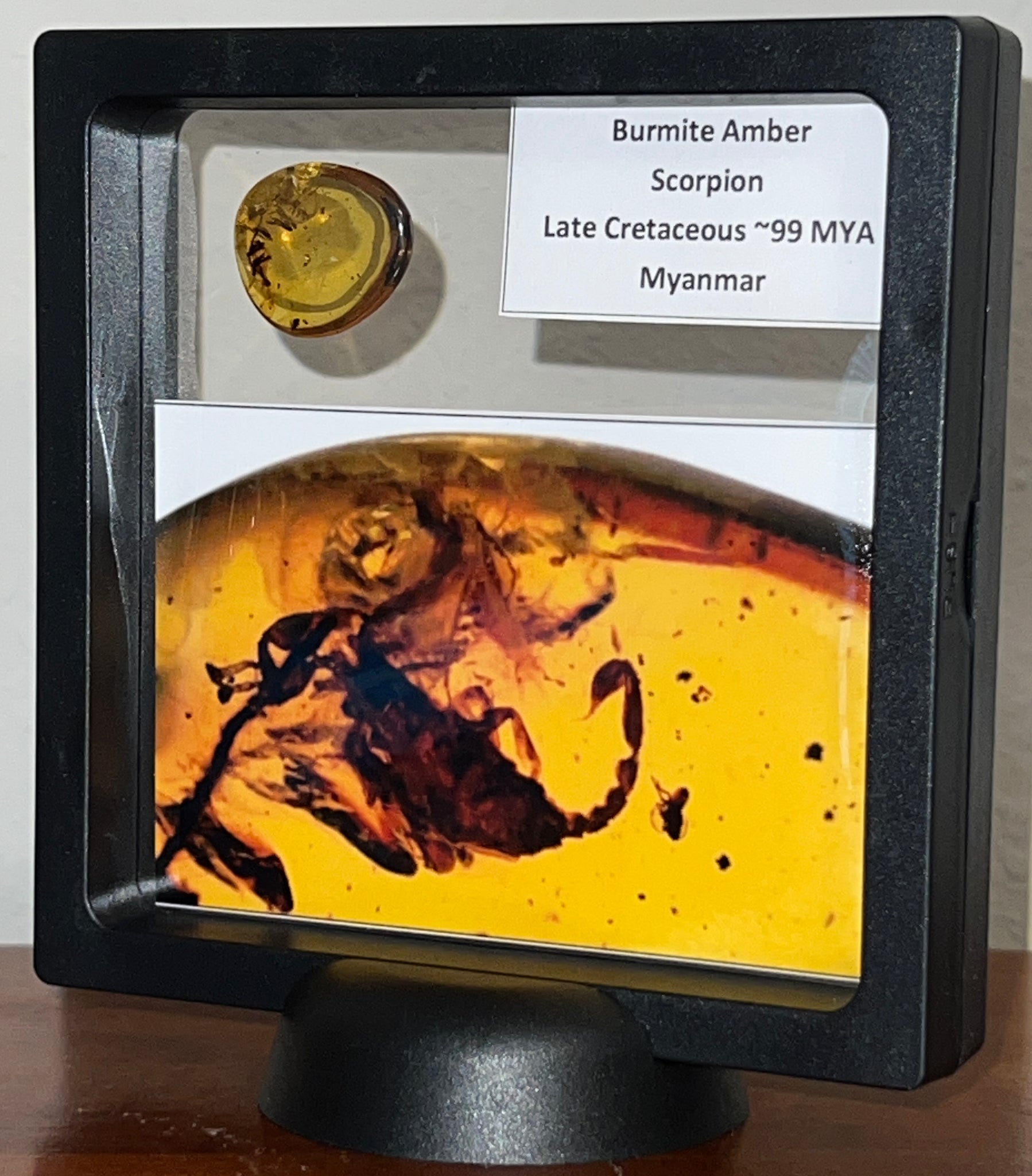 This a beautiful piece of amber with a Rare Large Scorpion from the late Cretaceous of Myanmar! The Scorpion is in pristine condition with all limbs, segments, and even the stinger and claws in fine detail! It measures 8 mm, which very large for a burmite insect or arachnid! The amber is gorgeous Gold Citrine color with Incredible Gem Quality clarity! The amber's dimensions measure 23 x 19.3 x 5.8 millimeters and weighs 1.44 grams! It comes in a floating frame with a stand, blown up pictures of the inclusion, and detailed information for easy transport and a beautiful display!