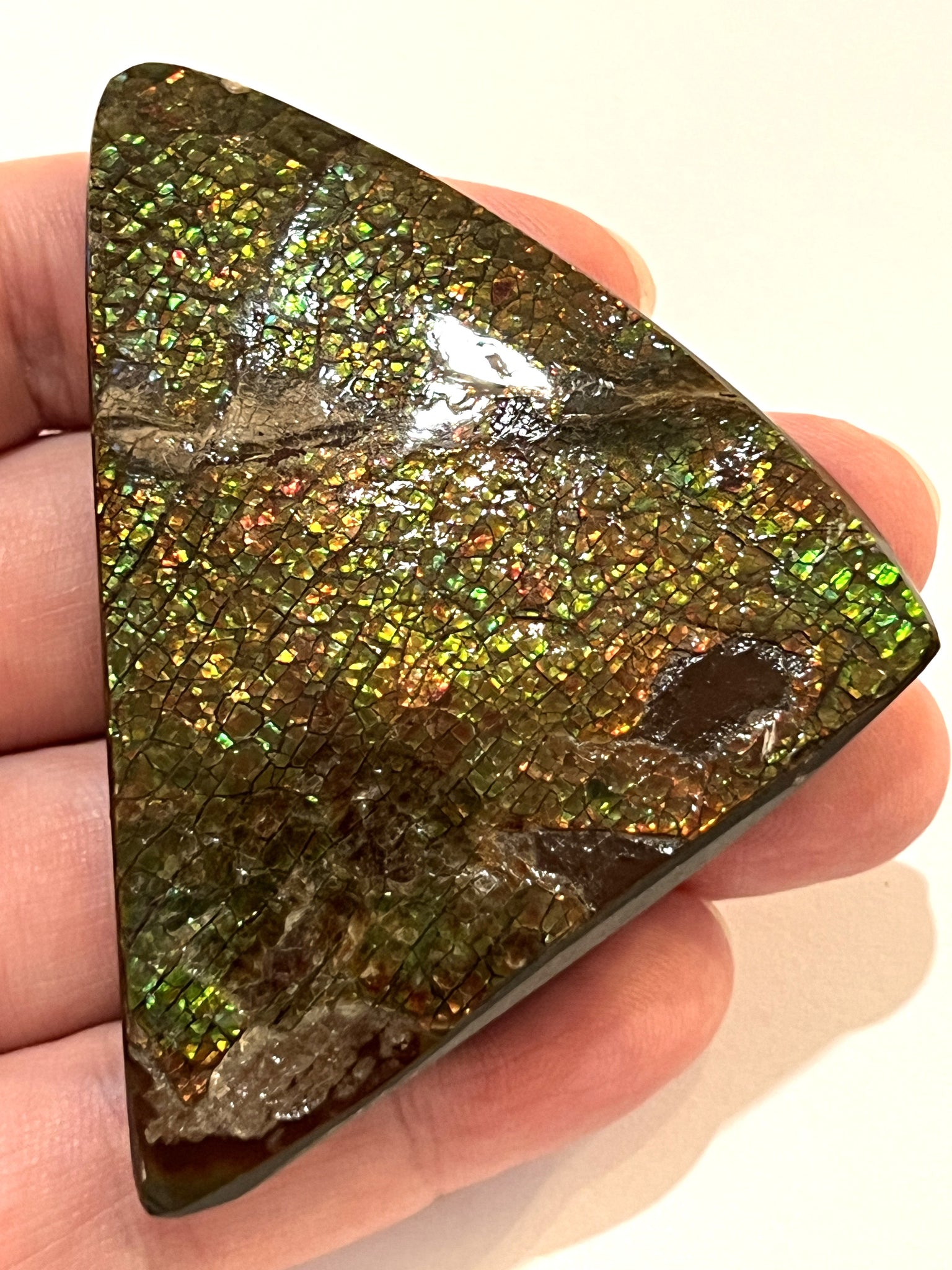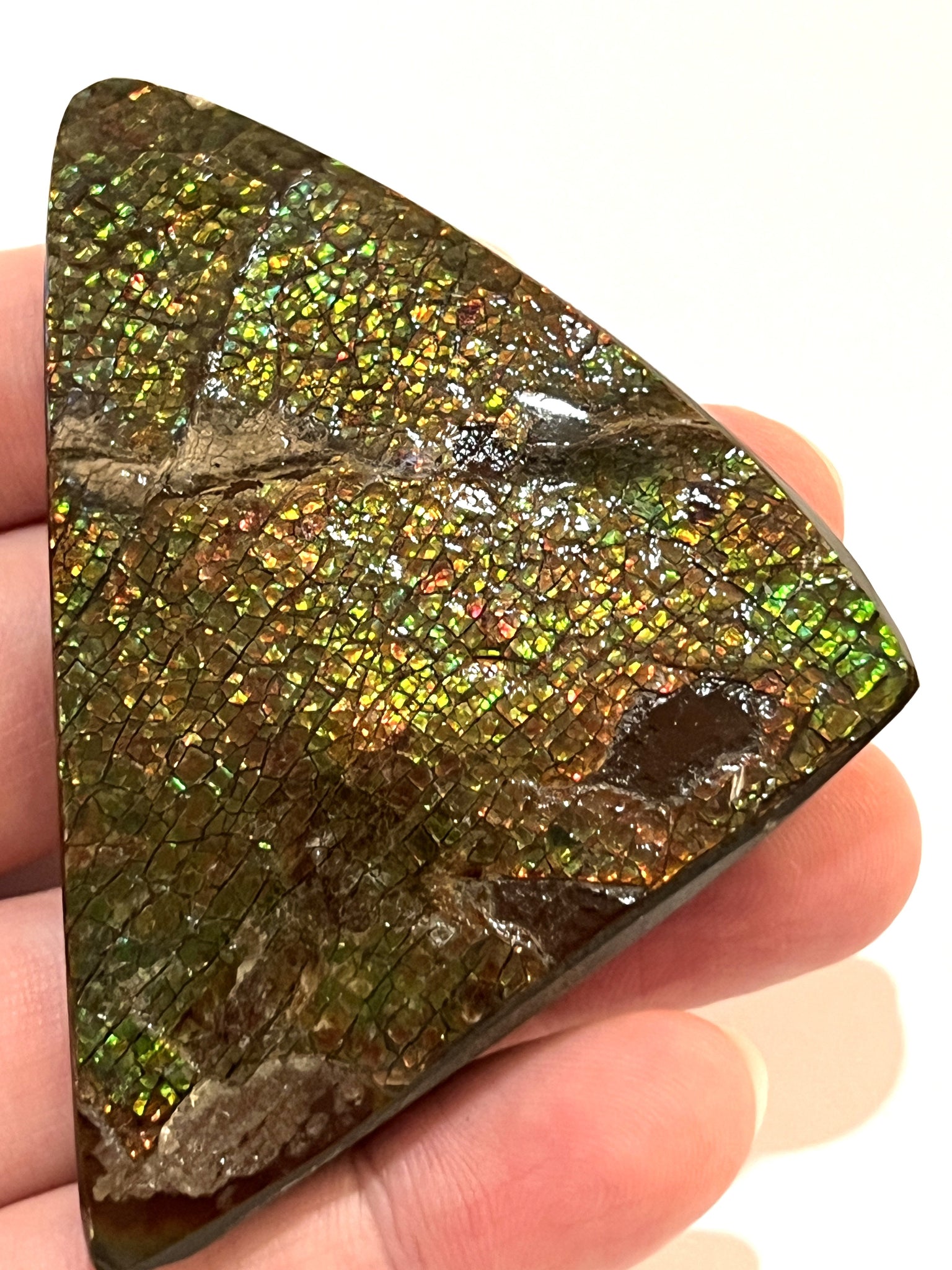 Ammolite is an opal like gemstone made from Ammonite fossil shells found in specific areas of the eastern slopes of the Rocky Mountains. It's status as a gemstone is fairly recent, being officially designated as such in 1981. Ammolite gemstones typically consist of a fragment of an ammonite on the rock on which it was found and the coated in a layer of epoxy to protect the fragile fossil shell and stabilize the rock. The shell is primarily composed of Aragonite, but can have traces of other minerals and elements as well. It is the Aragonite of the shells and the unique way in which light interacts with this mineral that produces the stunning array of colors seen on specimens!