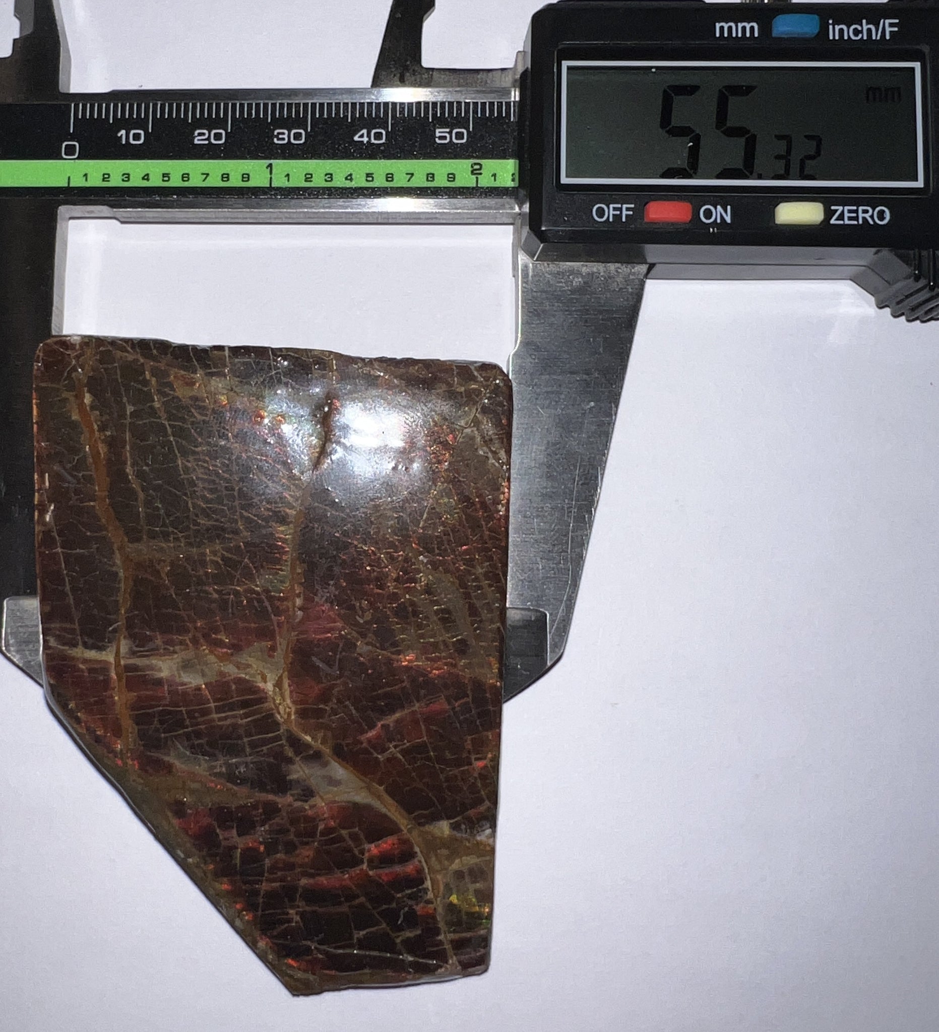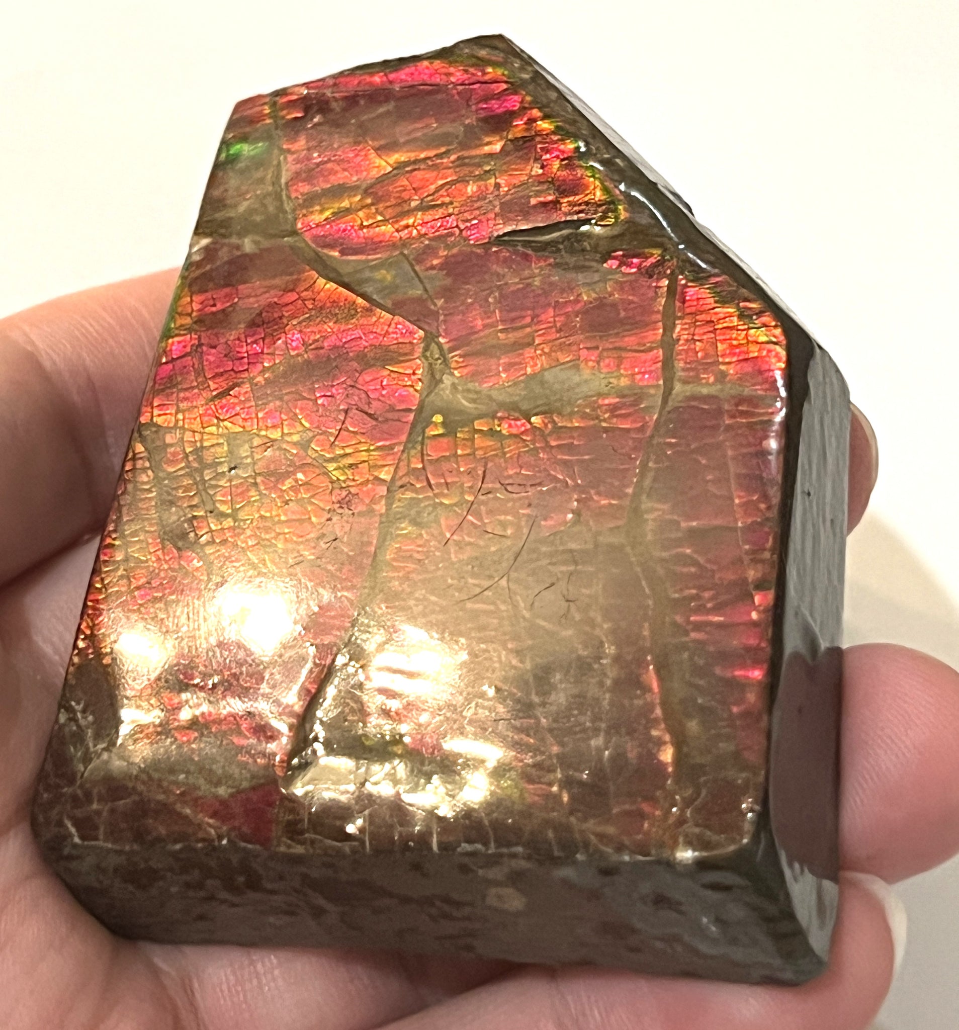 This is a Beautiful Ammolite gemstone from the Bearpaw Formation of Alberta, Canada! The piece has fantastic iridescence showing a beautiful Cherry Red Color with bits of Yellow and Green! It measures about 3 inches (7.59 cm) across and weighs 146.7 grams!
