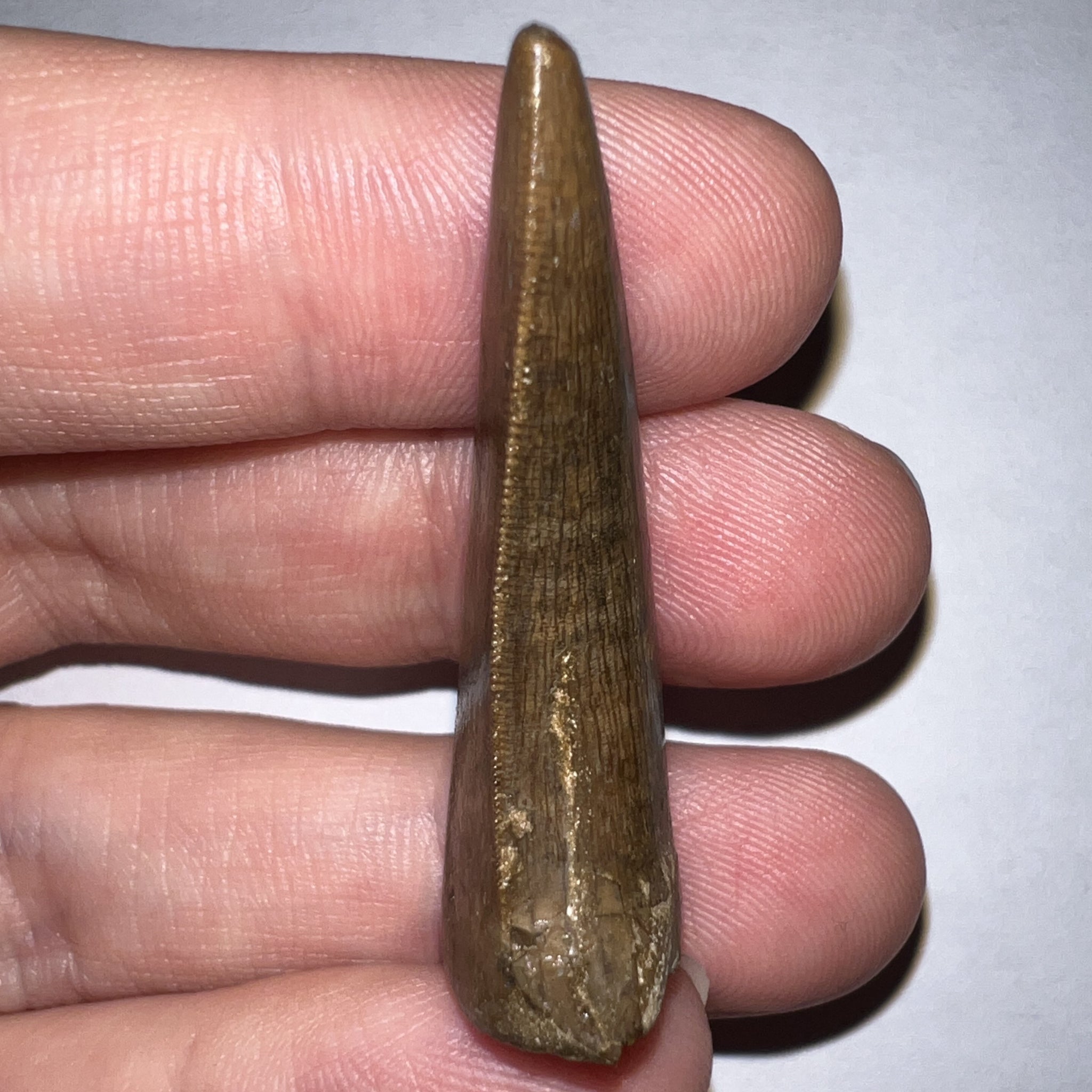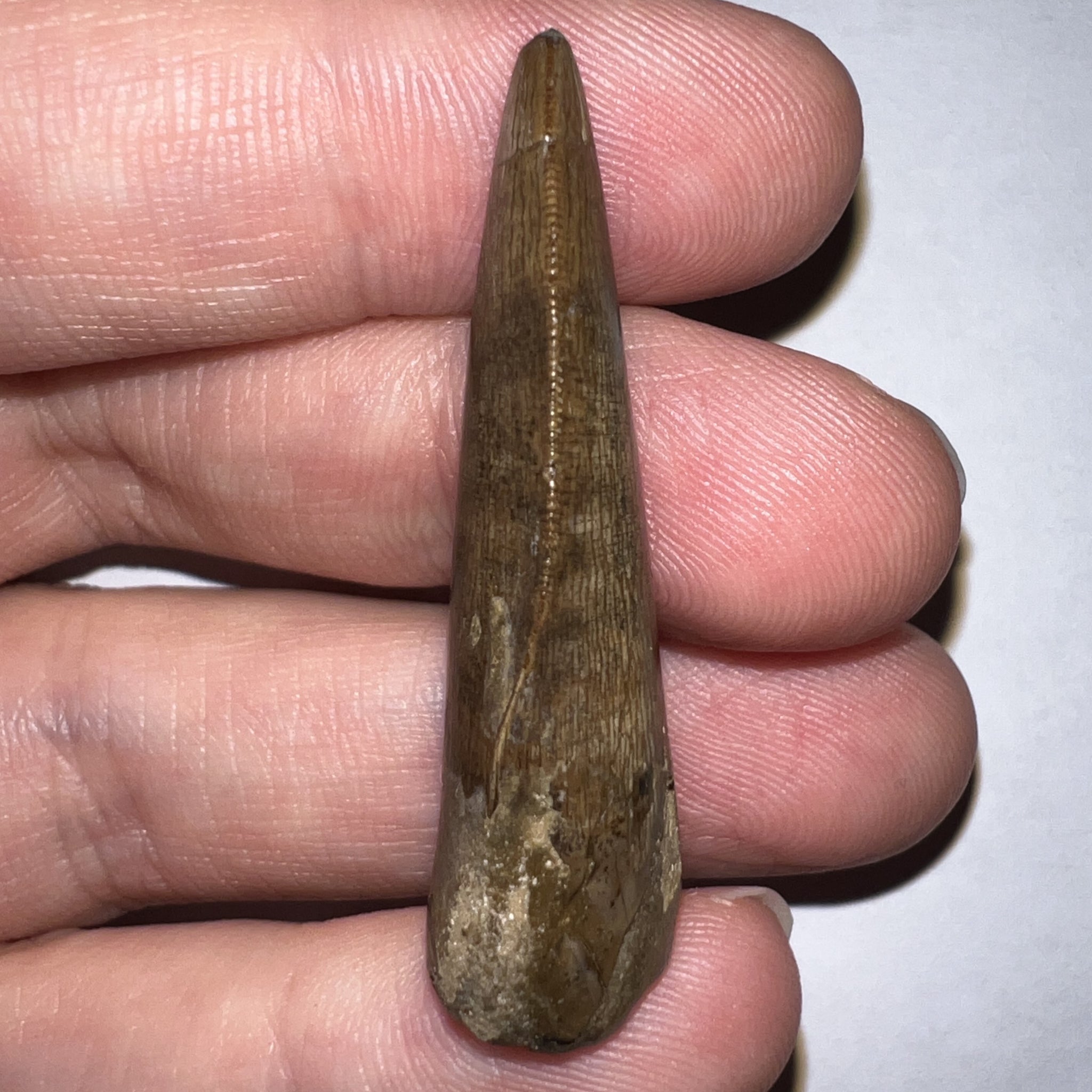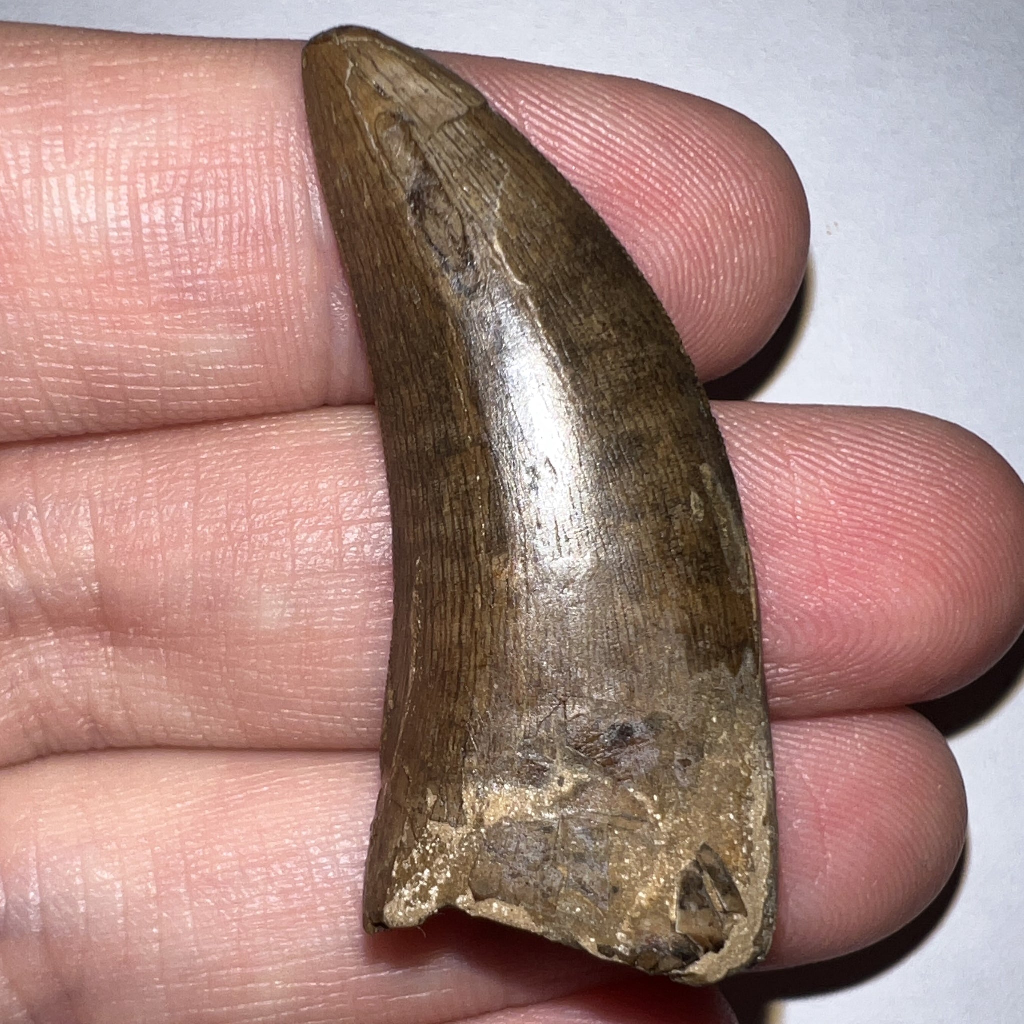 And now for that which needs no introduction, but will get one anyway. This Is a GORGEOUS tooth from TYRANNOSAURUS REX from the Hell Creek Formation in Garfield County, Montana, USA! The tooth has Fantastic serrations, a great tip, and a partial root! The only damage is a crack with some fill near the base. The tooth measures 1.71 inches (4.34 cm) along its longest edge (straight line measurement)! It comes in a double sided clear display case with a stand for easy transport and a beautiful display!