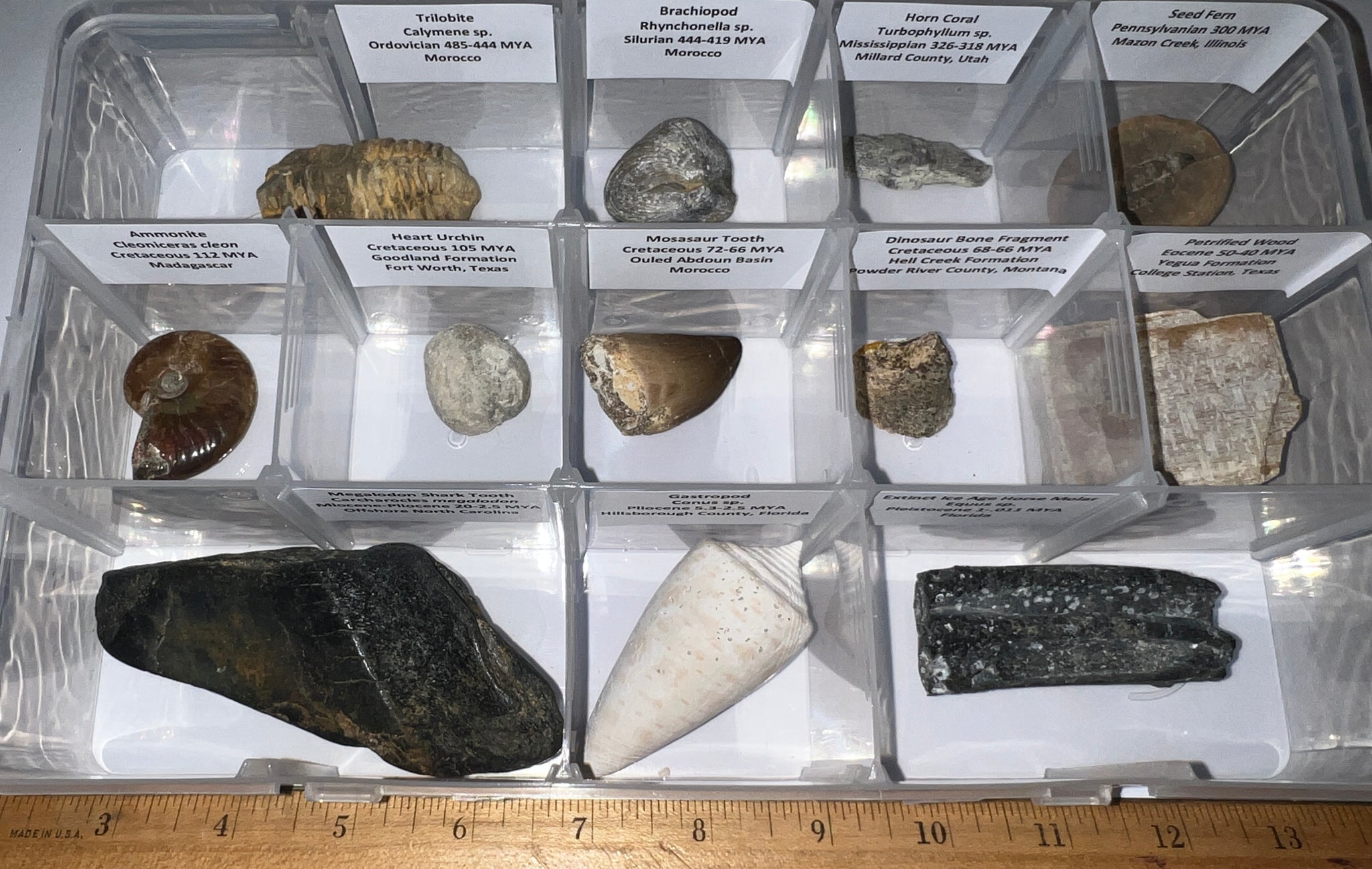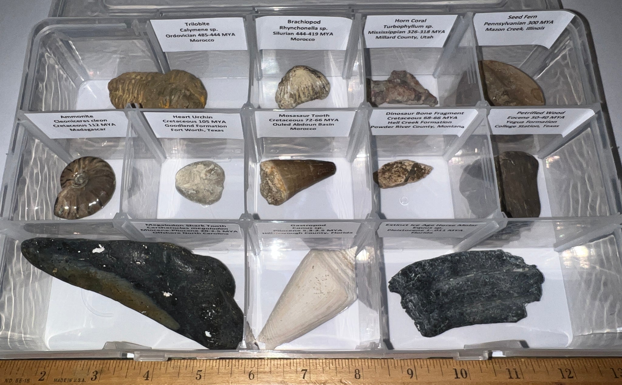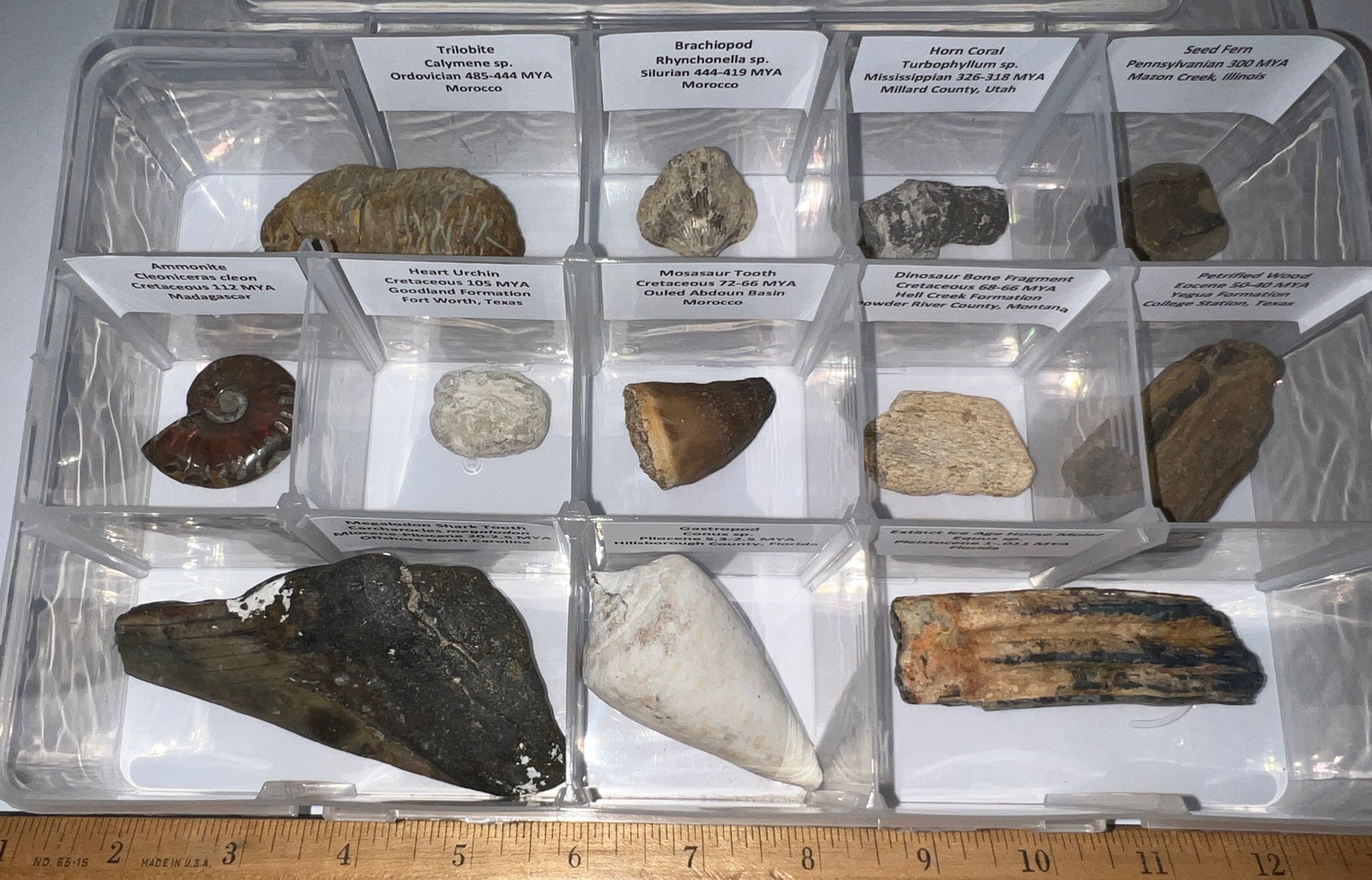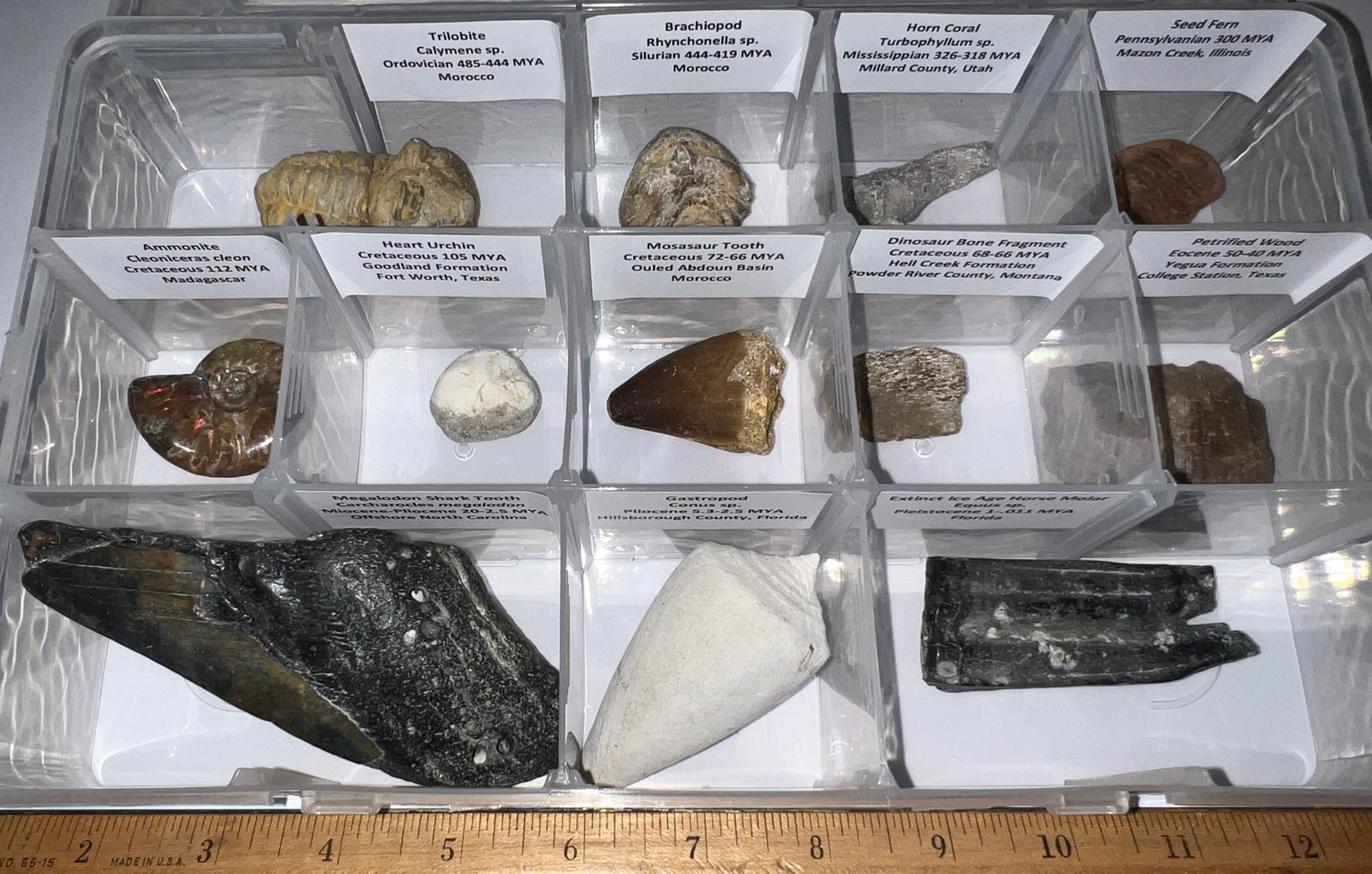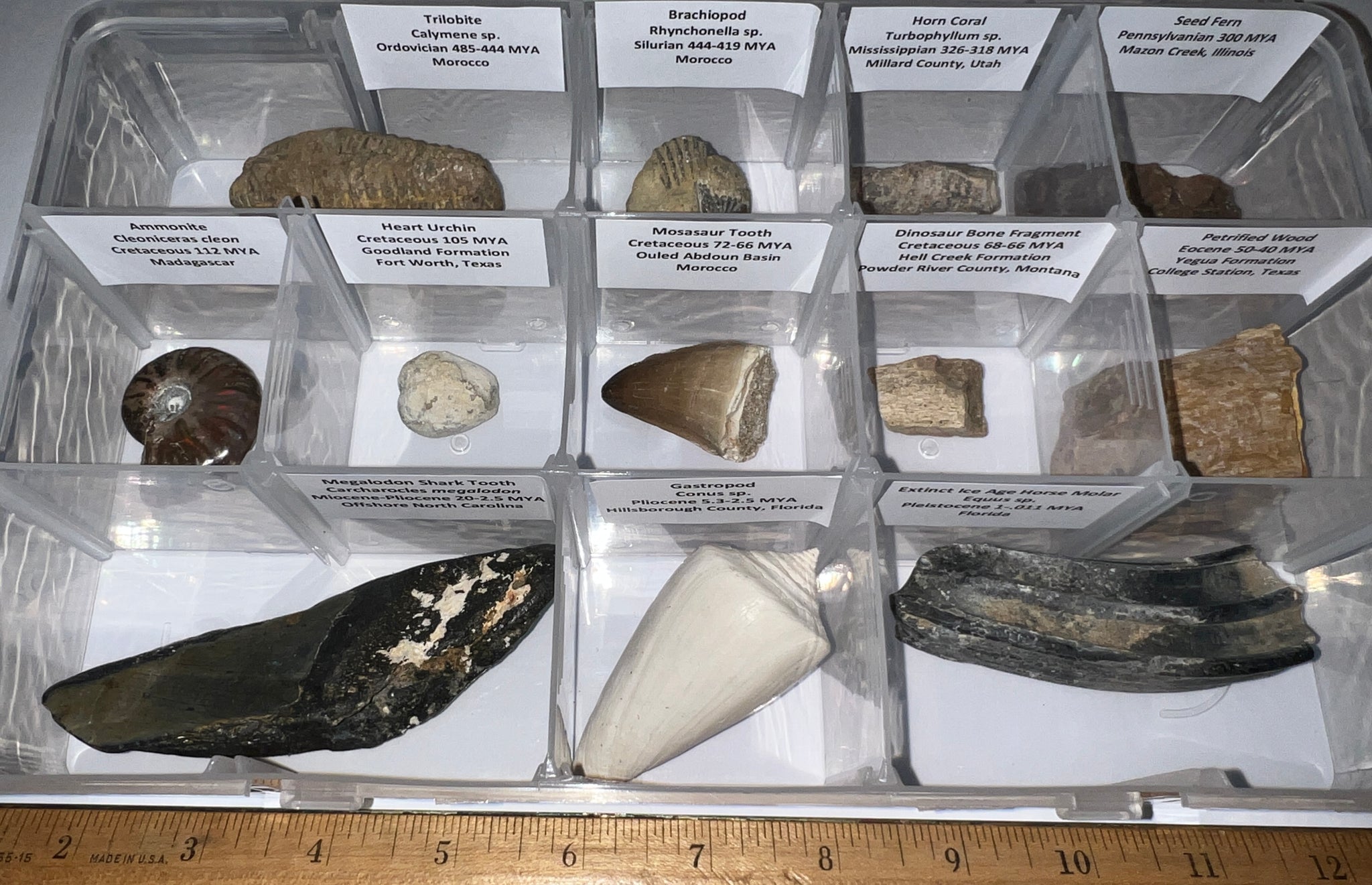 The Horse Teeth, Dinosaur Bone Fragments, Brachiopods, Horn Corals, Seed Ferns, Ammonites, Heart Urchins, Petrified Wood, Gastropods, and Megalodon Teeth have no repair or restoration.