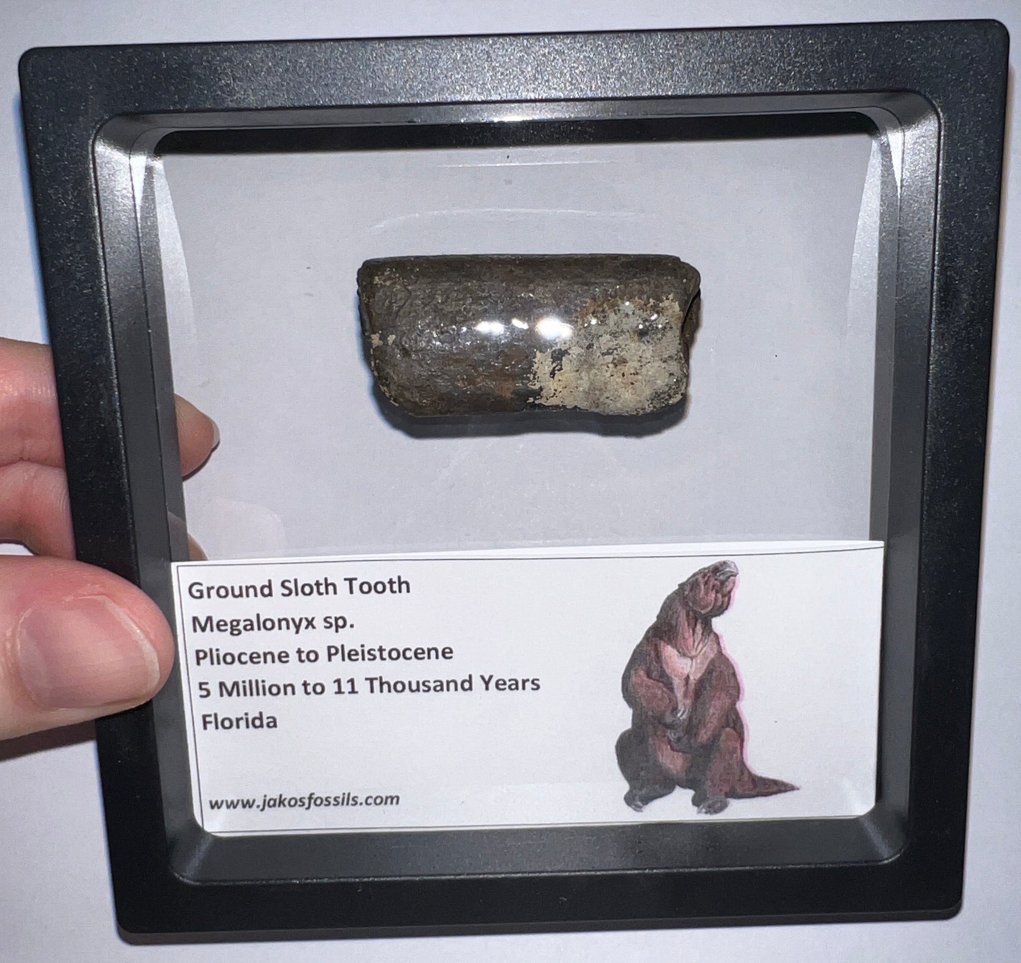 This is a Beautiful molar from Megalonyx, a Ground Sloth from the Pleistocene of Florida! The molar is in great condition with no repair or restoration! It measures 1.61 inches (4.09 cm) and comes in a double sided clear display case for easy transport and display!