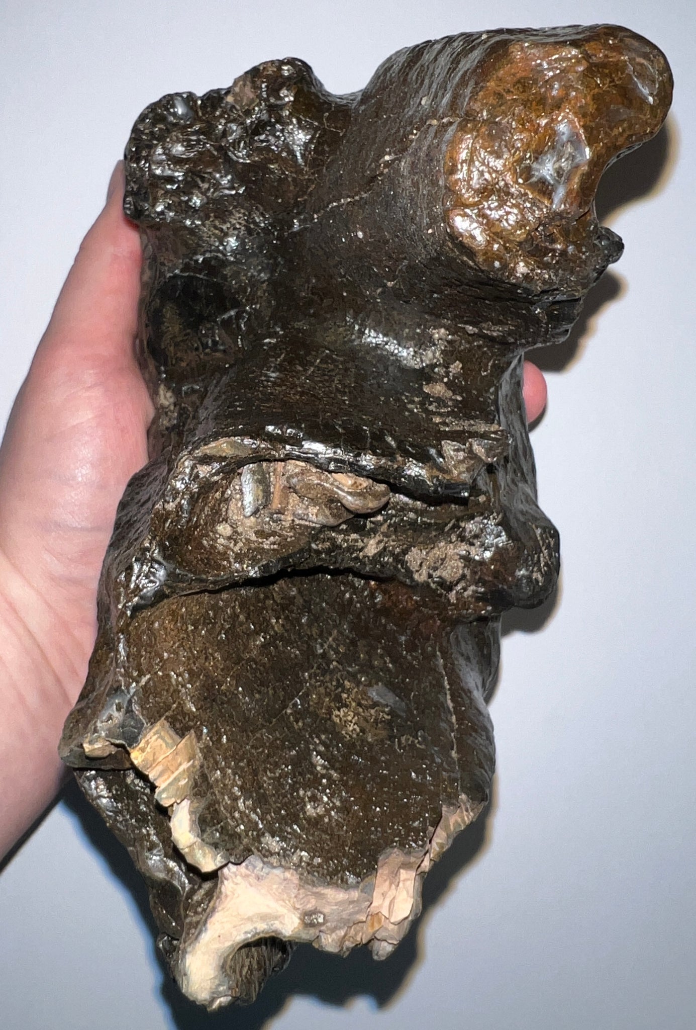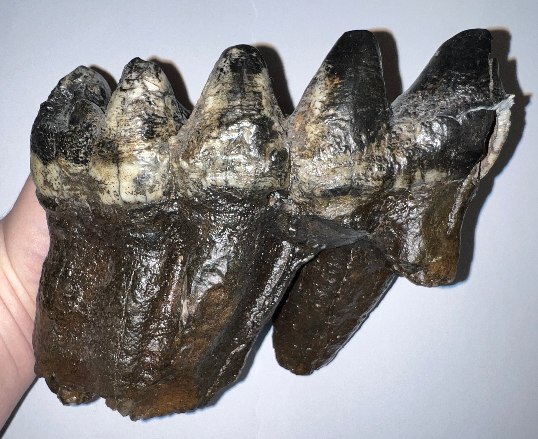 This is a BEAUTIFUL Fossil Molar from the American Mastodon (Mammut americanum) from the Pleistocene of Florida! The piece measures 6.86 Inches (17.42 cm) long, 6.5 Inches (16.51 cm) tall, 3.85 Inches (9.78 cm) thick, and weighs 3.72 pounds with fantastic humps and a terrific root with no repair or restoration!