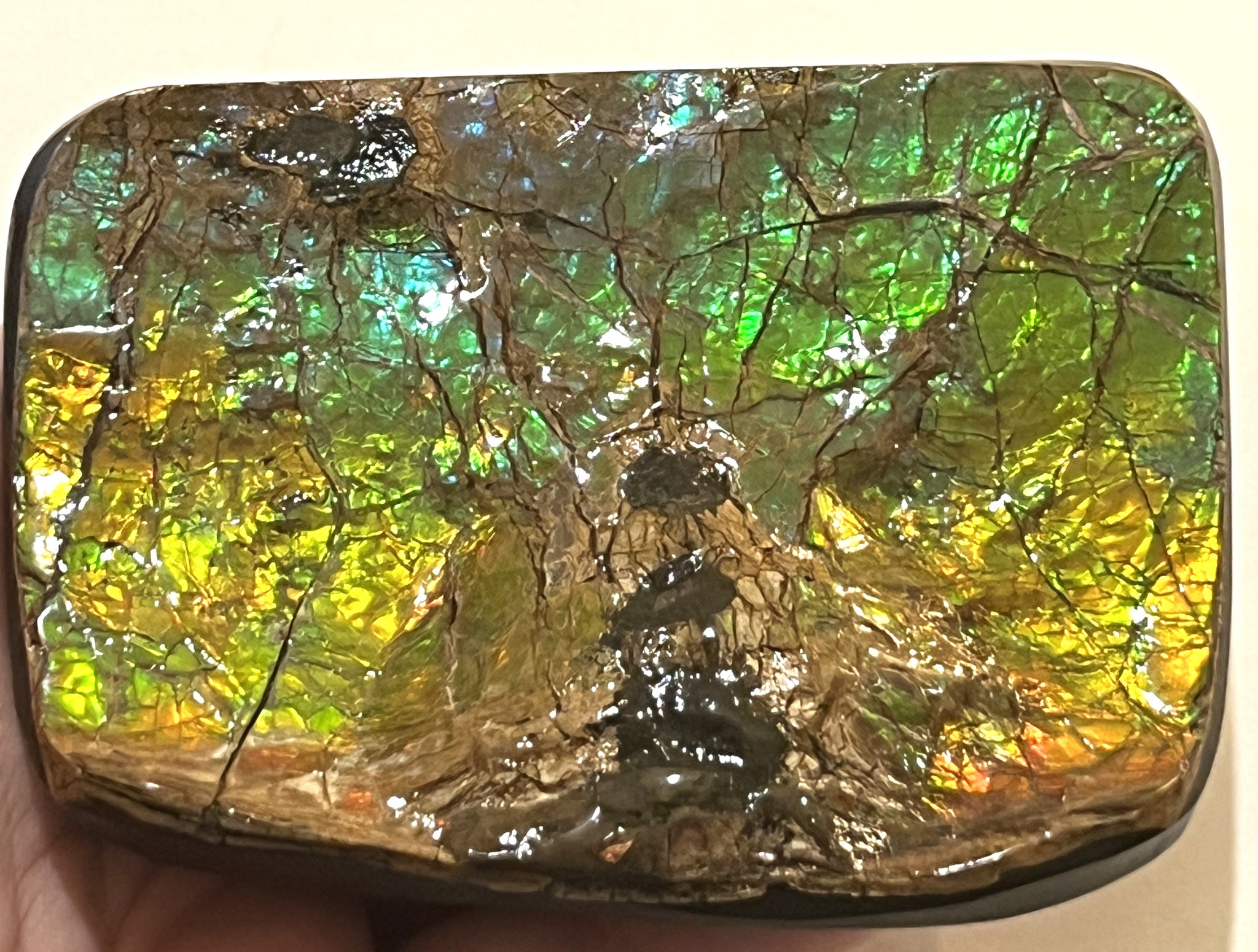 Ammolite is an opal like gemstone made from Ammonite fossil shells found in specific areas of the eastern slopes of the Rocky Mountains. It's status as a gemstone is fairly recent, being officially designated as such in 1981. Ammolite gemstones typically consist of a fragment of an ammonite on the rock on which it was found and the coated in a layer of epoxy to protect the fragile fossil shell and stabilize the rock. The shell is primarily composed of Aragonite, but can have traces of other minerals and elements as well. It is the Aragonite of the shells and the unique way in which light interacts with this mineral that produces the stunning array of colors seen on specimens!