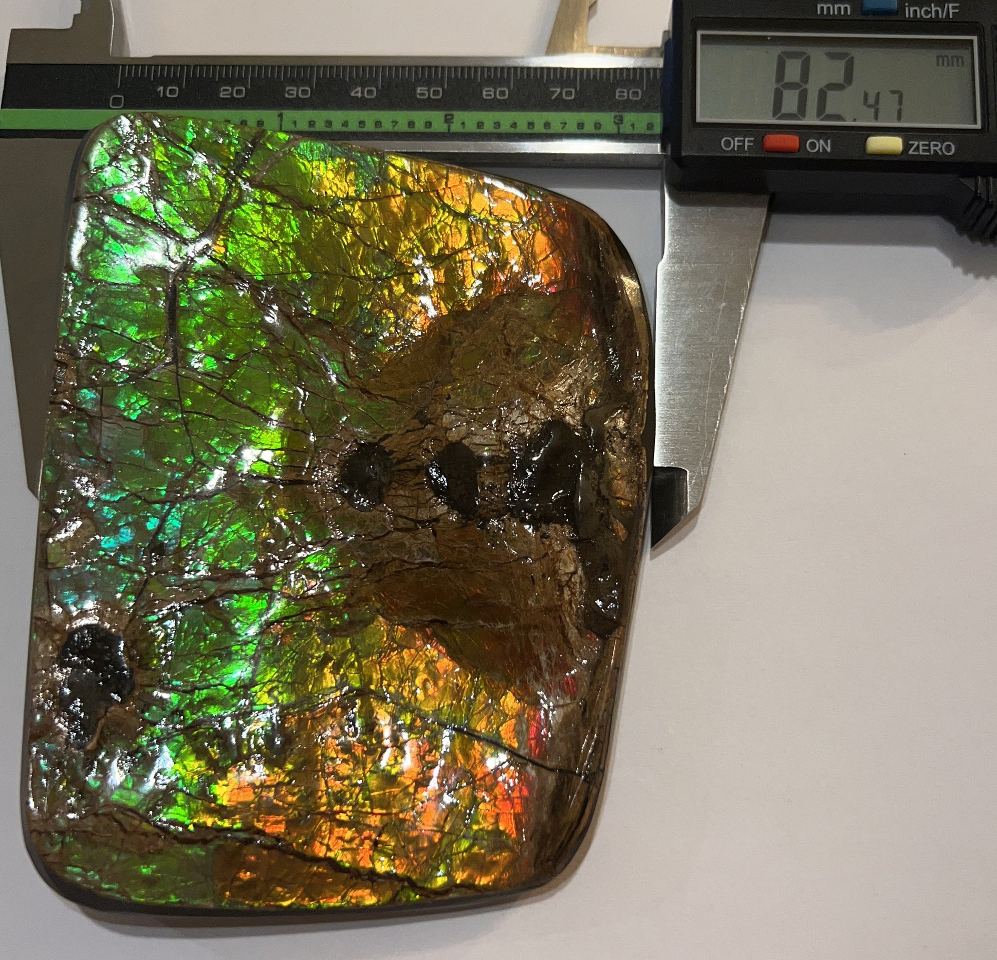 This is a Beautiful Ammolite gemstone from the Bearpaw Formation of Alberta, Canada! The piece has fantastic iridescence showing beautiful full Rainbow of Colors! The piece also shows Mosasaur bite marks, a very rare feature on an already beautiful piece! It measures about 4.3 inches (10.97 cm) across and weighs 343.1 grams!