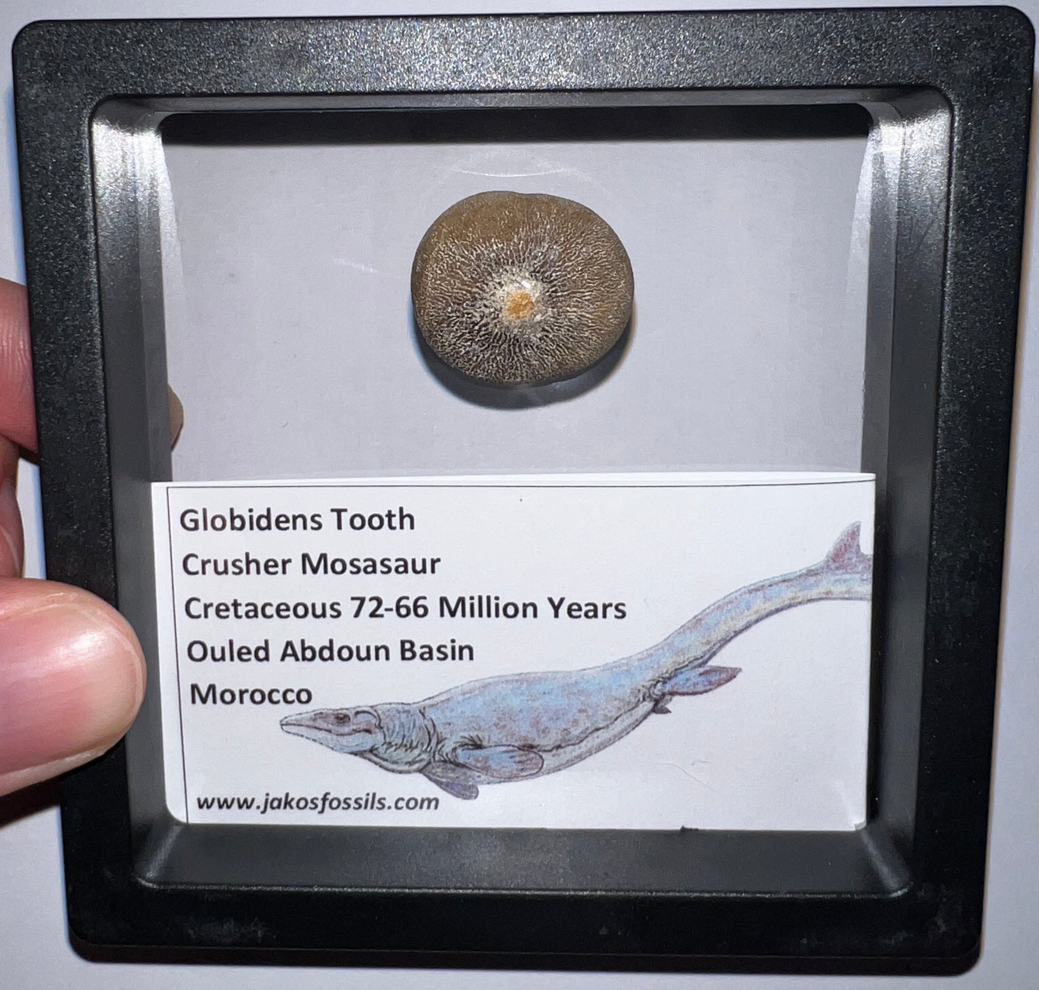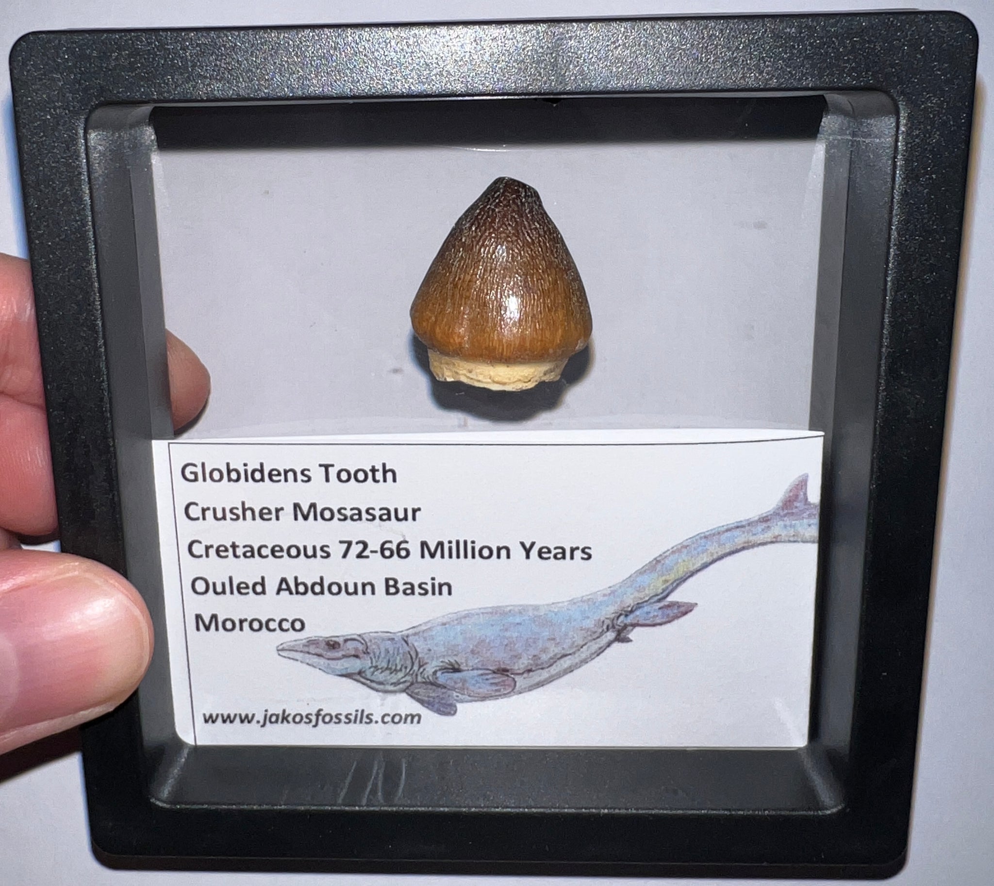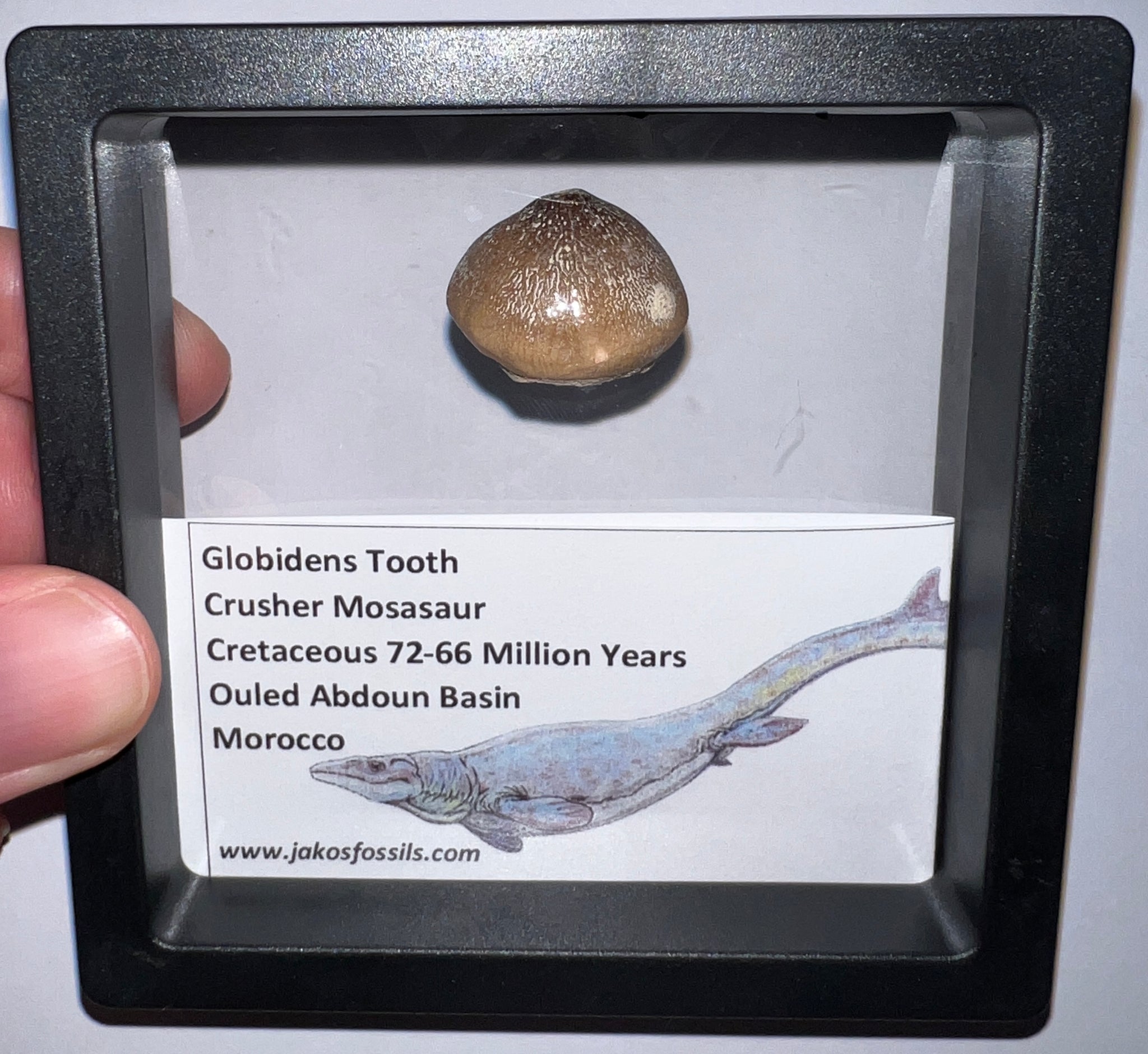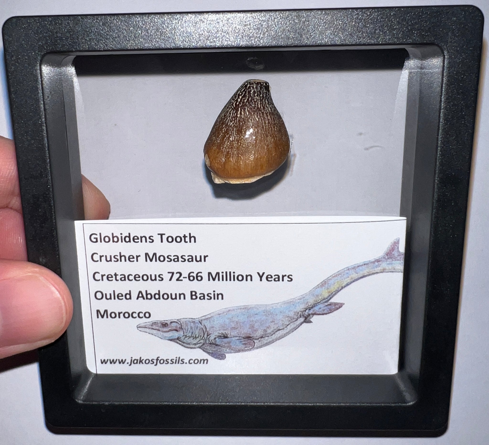 Each Tooth comes in a 3.5 x 3.5 inch floating frame with and info card that labels the fossil and details the age and location it was found and some fun facts about Mosasaurs!