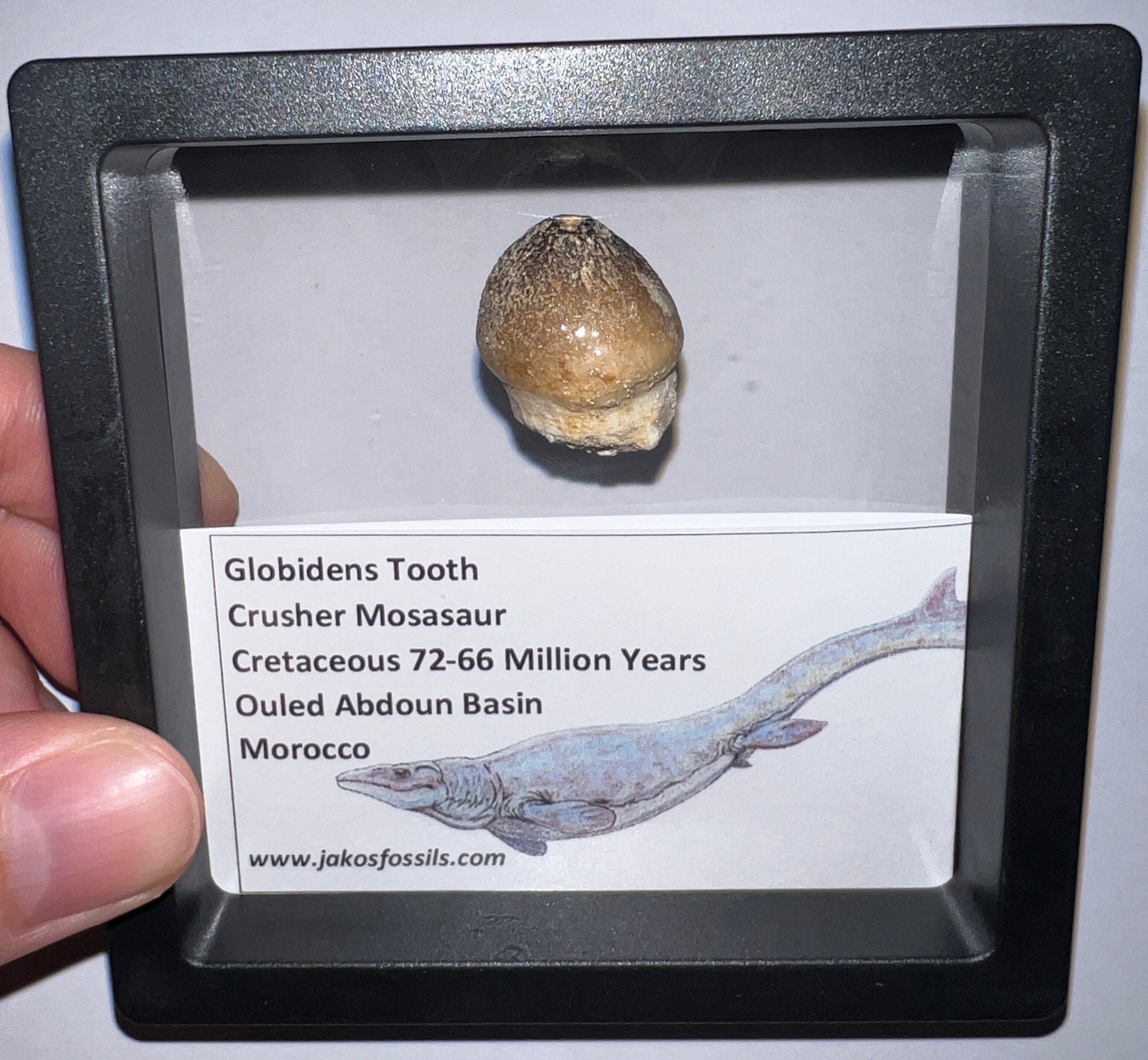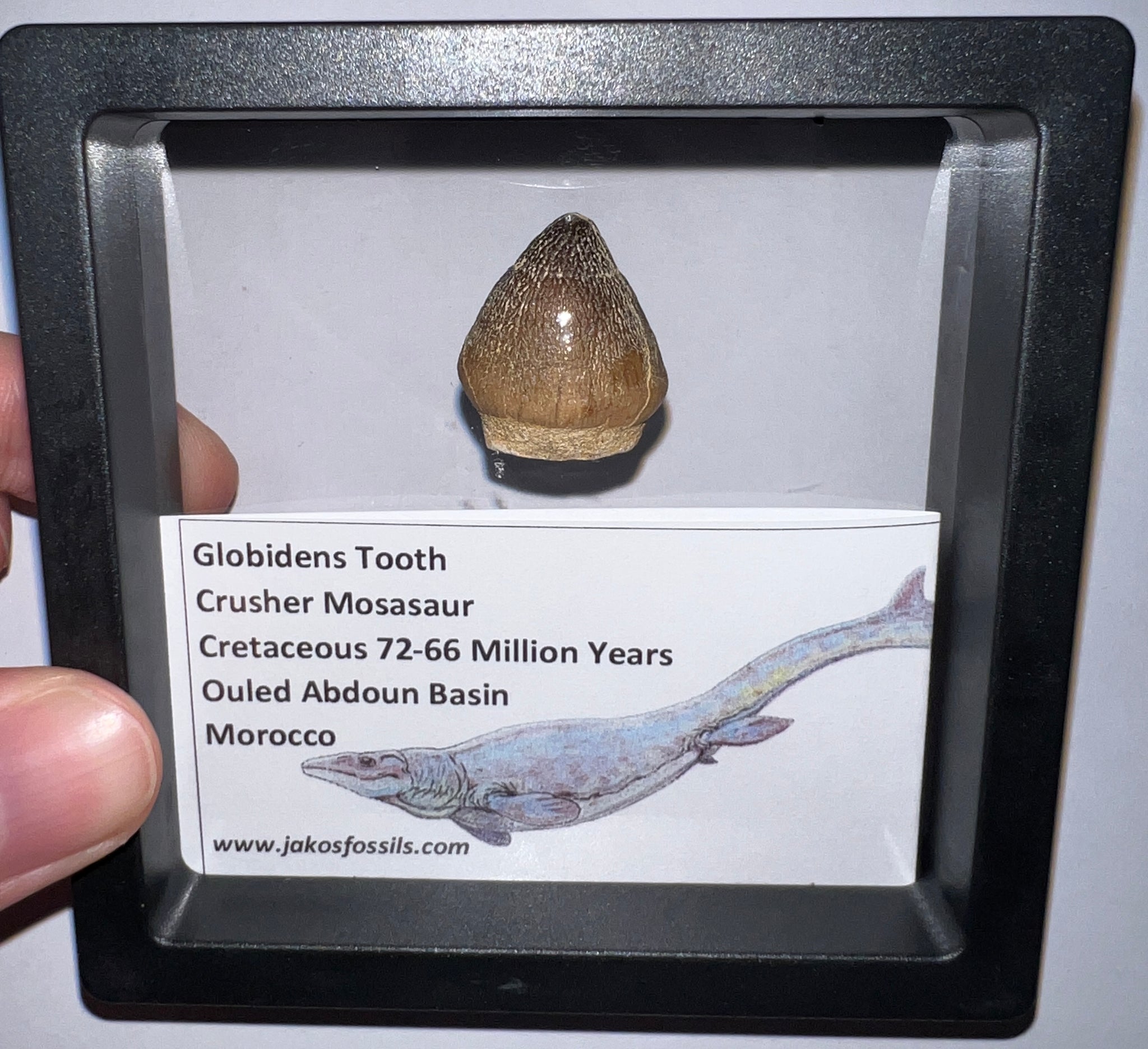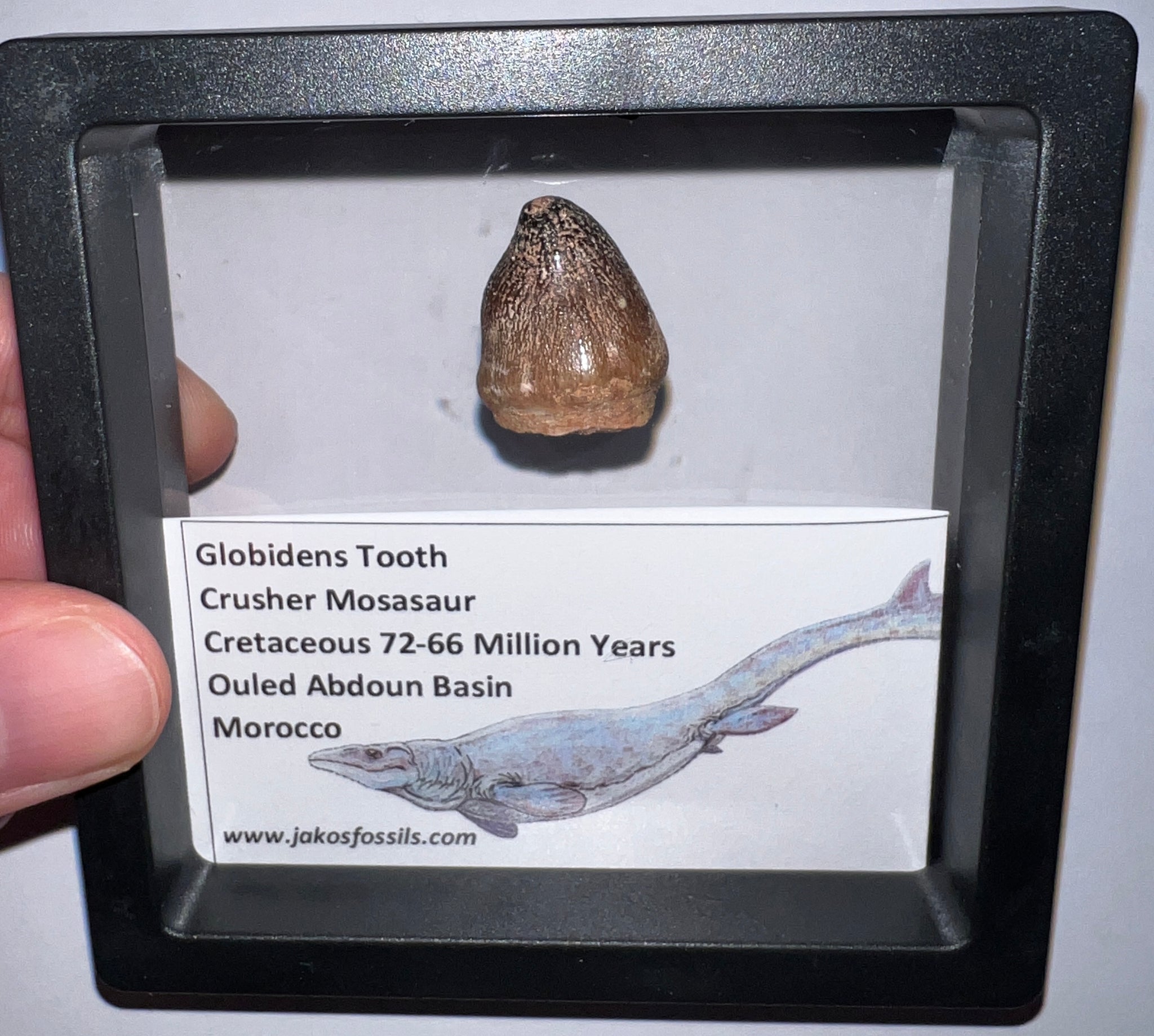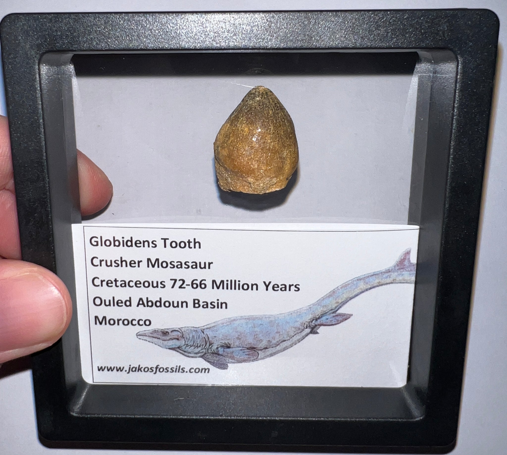 Each Tooth comes in a 3.5 x 3.5 inch floating frame with and info card that labels the fossil and details the age and location it was found and some fun facts about Mosasaurs!