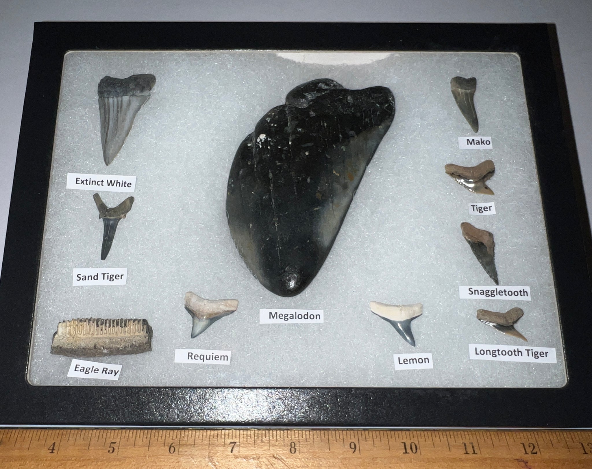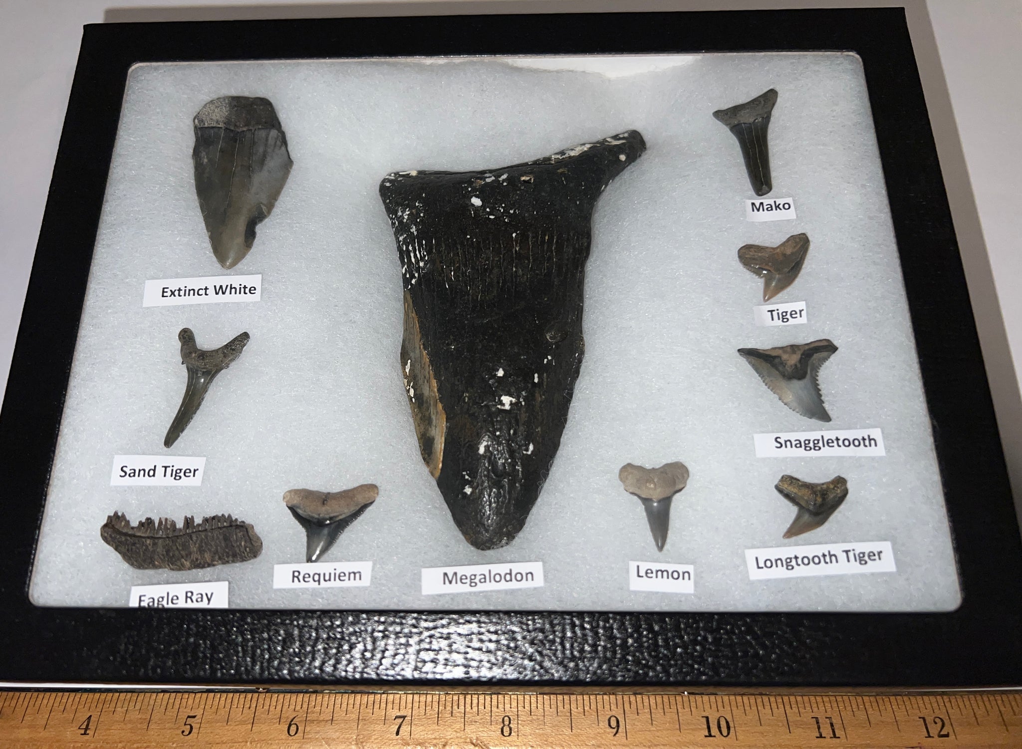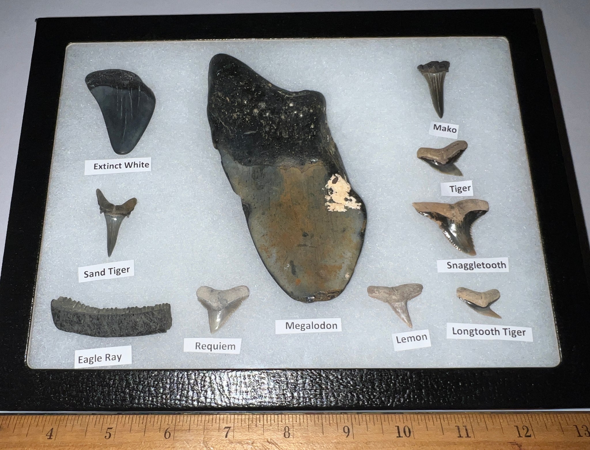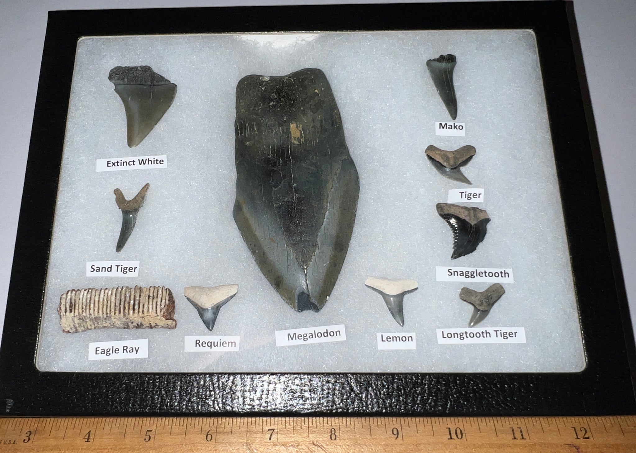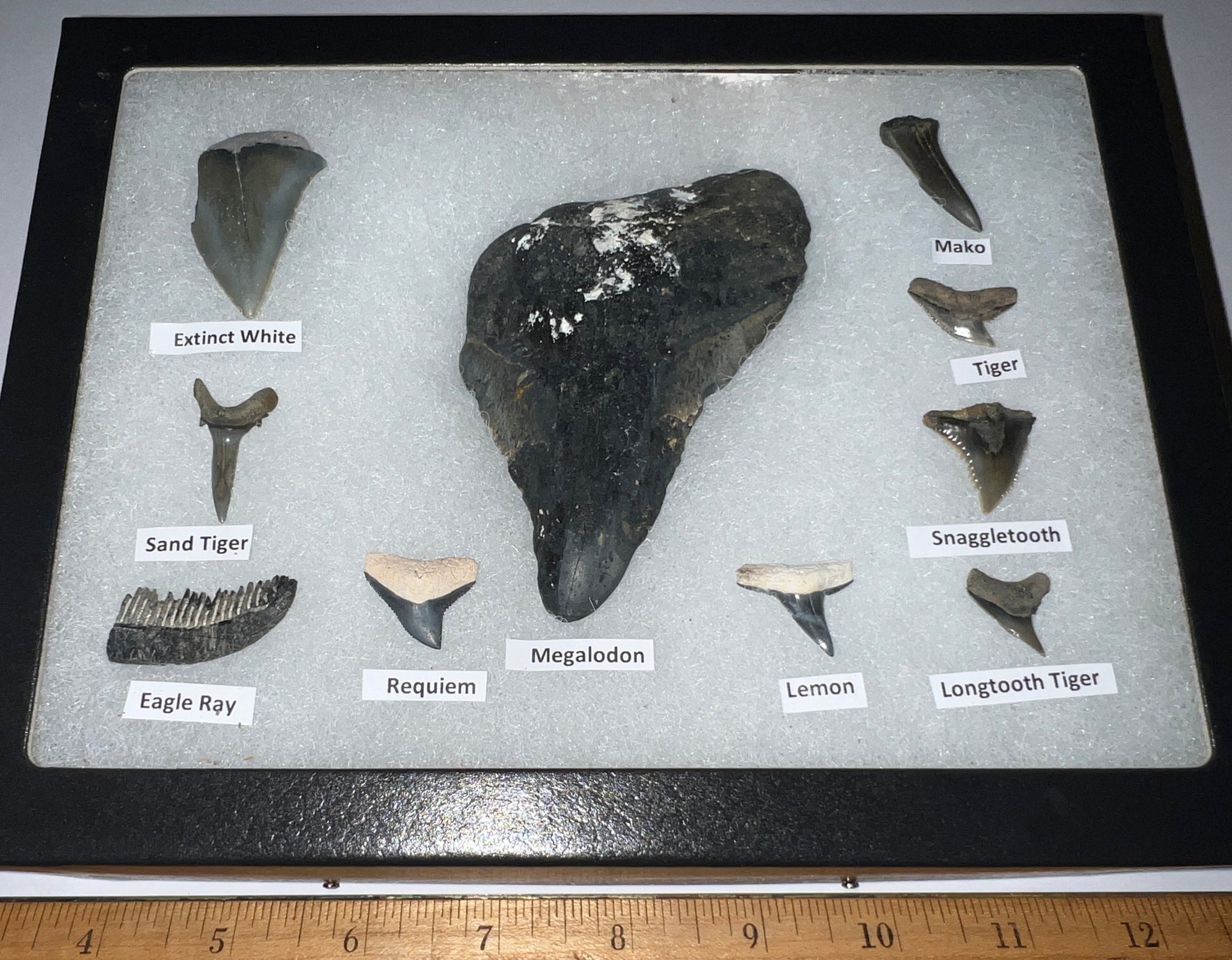 XL Premium Labeled 10 Fossil Shark Tooth Collection in a Riker Mount with a Megalodon