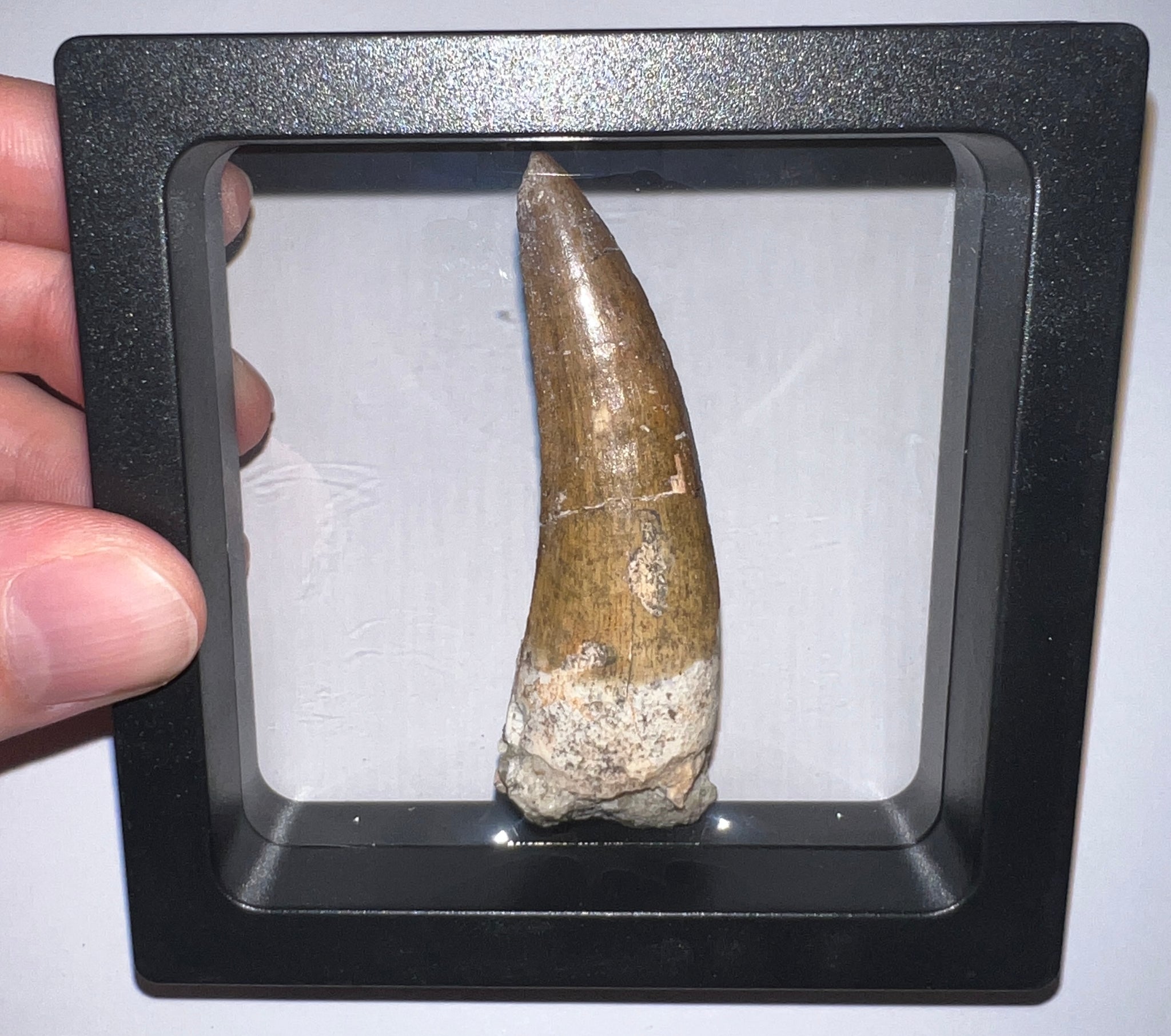 This is a Huge GORGEOUS tooth from one of the rarest dinosaurs in the world, Suchomimus tenerensis, from the Elrhaz formation of the Cretaceous of Gadoufaoua, Tenere Desert of Niger! The tooth is in incredible condition with a partial root, fantastic tip, and great serrations characteristic of, but almost never seen on, Suchomimus teeth except those of very high quality! The tooth measures 2.5 inches (6.35 cm)! It has a couple repaired breaks, but isn't restored in anyway! It comes in a clear double sided case for easy transport and display!