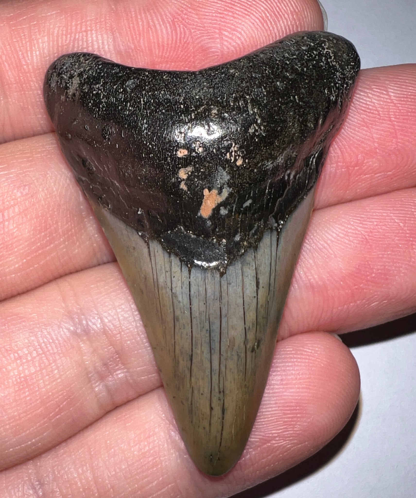 This is a Beautiful Fossil Megalodon Shark Tooth from offshore North Carolina U.S.! Megalodon (Carcharocles megalodon) was the largest known species of shark to have ever lived. It grew to over 60 feet (18 meters) in length and fed primarily on large marine mammals including whales, dolphins, seals, manatees, and even the occasional Mammoth out for a swim. A great addition to any fossil collection or gift for aspiring paleontologists, the tooth measures 2.08 inches (5.28 cm) along its longest edge with no repair, restoration, or alteration!