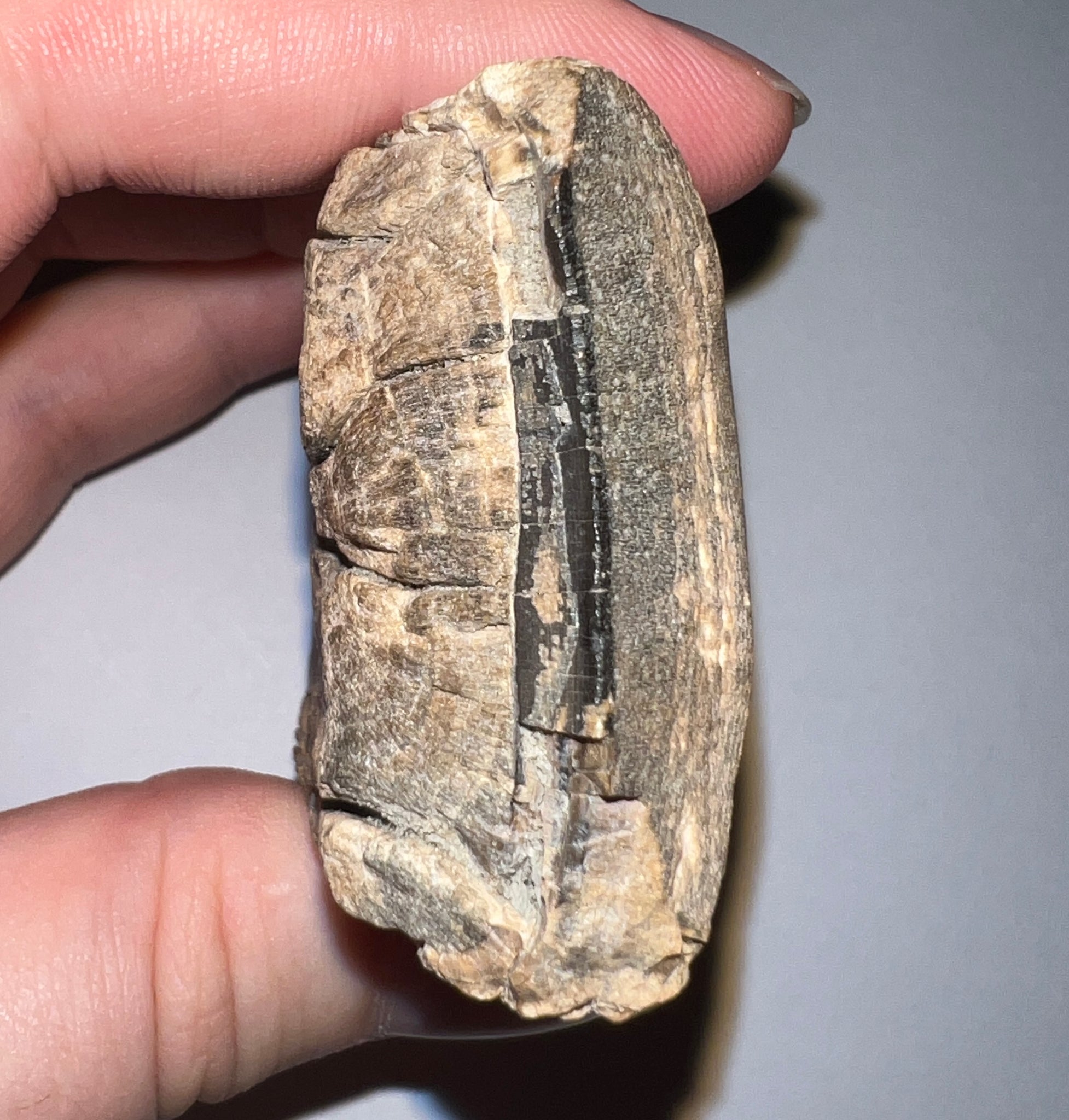 This is a Beautiful huge partial tooth from Eremotherium, a Giant Ground Sloth from the Pleistocene of South Carolina! The tooth measures 3.33 inches (8.46 cm) with no repair or restoration! It comes in a double sided clear display case with a stand for easy transport and a beautiful display!