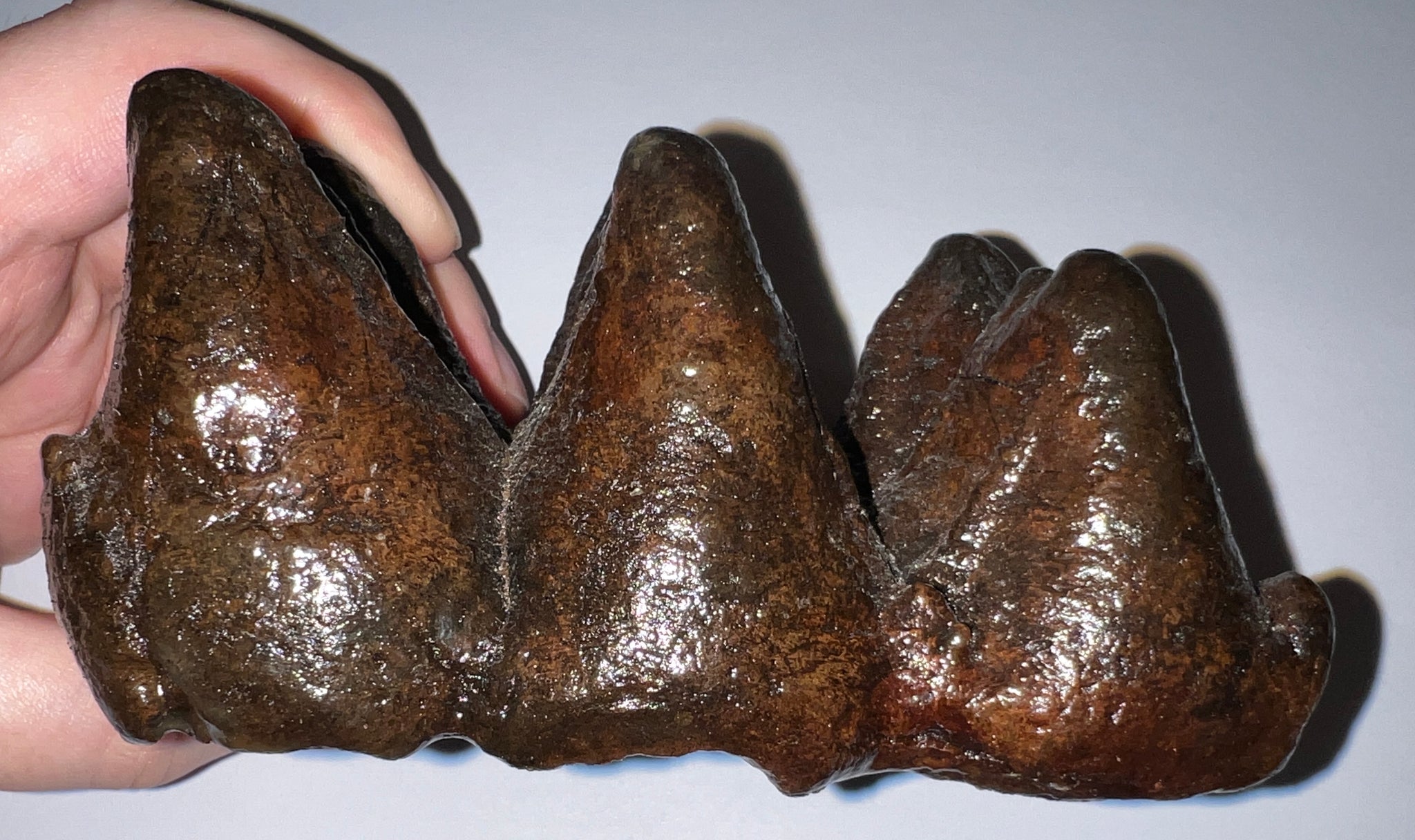 This is a BEAUTIFUL Top Quality Fossil Molar from the American Mastodon (Mammut americanum) from the Pleistocene of Florida! The piece is a rare unerupted molar, a molar that had just formed within the jaw and hadn't broken through and been used yet! The tooth had only so recently formed that the root hadn't even formed yet, but the beautiful and pristine crown had! The piece measures 5.52 Inches (14.02 cm) long, 3.89 Inches (9.88 cm) thick, 2.72 Inches (6.91 cm) tall, and weighs 1.23 pounds with pristine humps and no repair or restoration! It has been coated in a layer of acrylic for added stability!