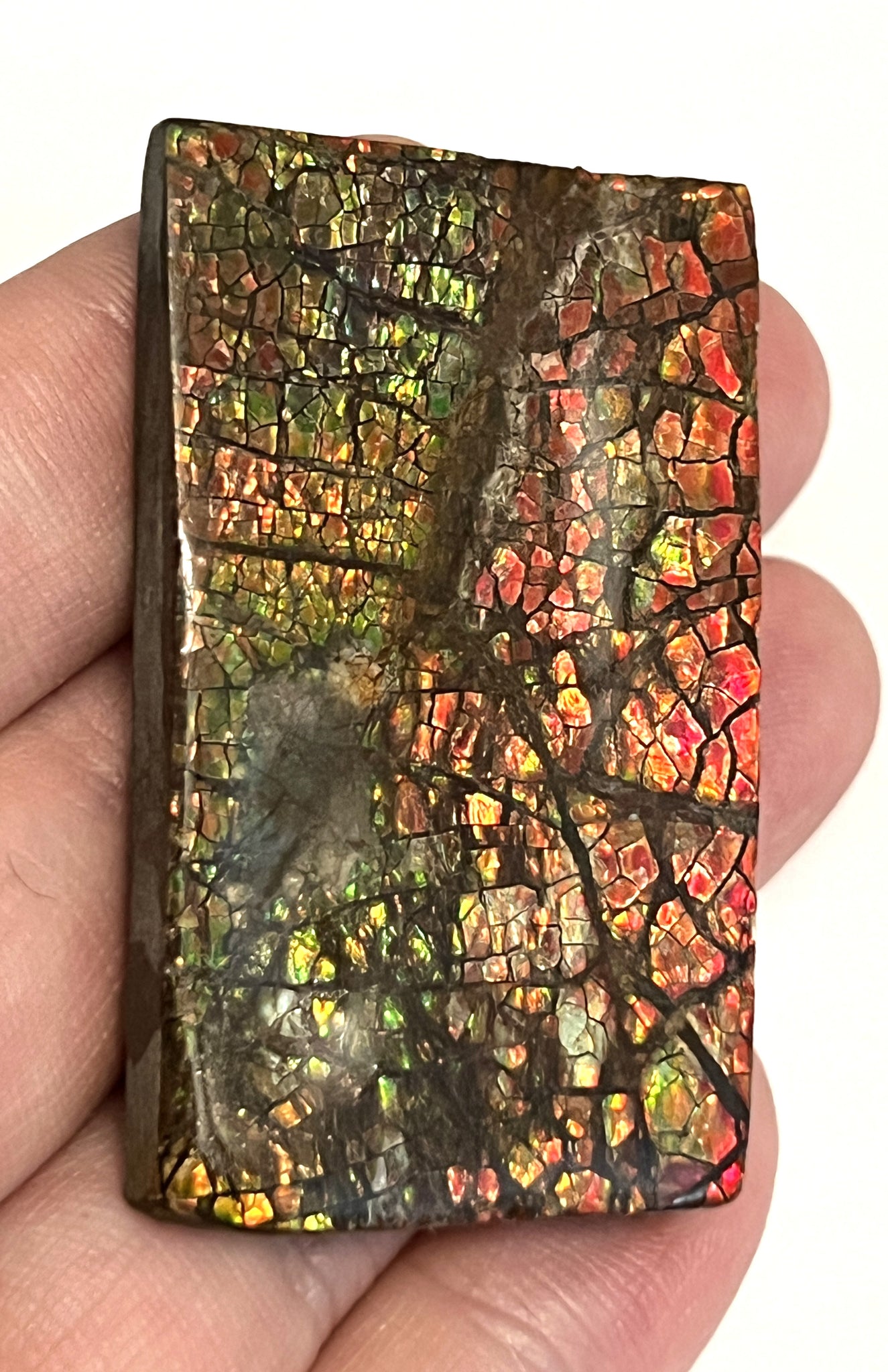 This is a Beautiful Ammolite gemstone from the Bearpaw Formation of Alberta, Canada! The piece has fantastic iridescence showing beautiful Orange, Red, Yellow, and Green Colors! It measures about 2.1 inches (5.34 cm) across and weighs 36.2 grams!
