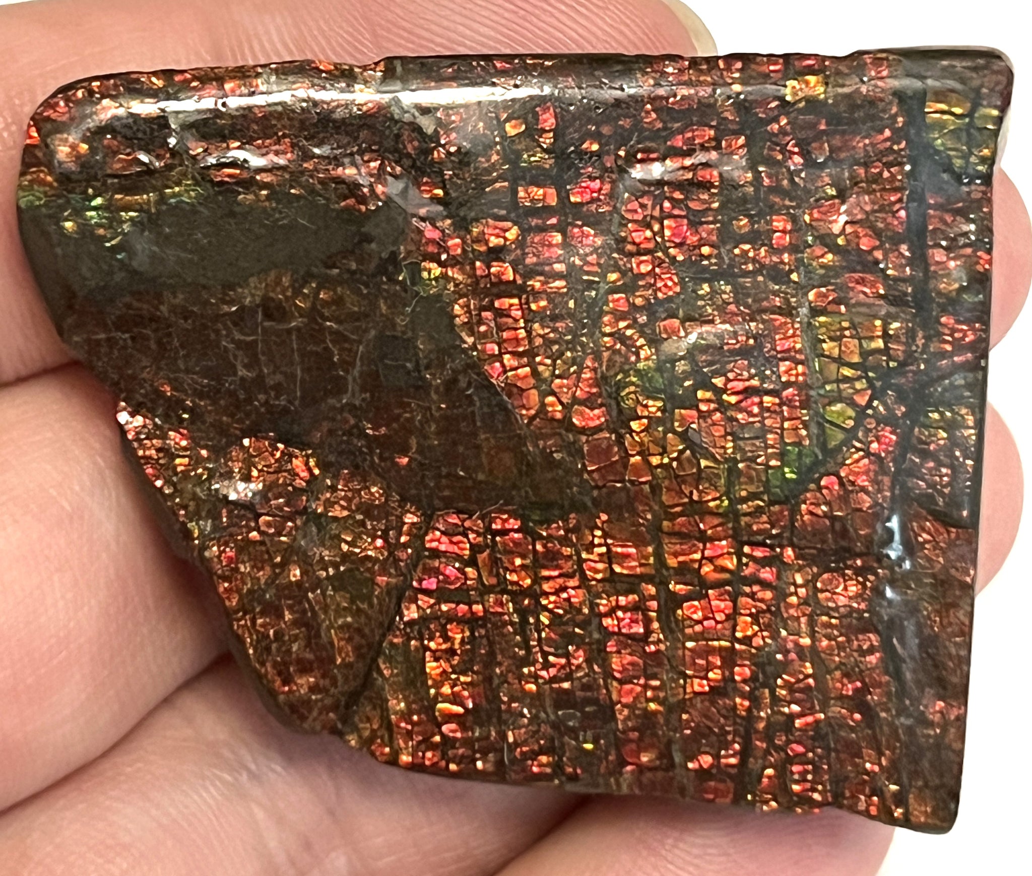 This is a Beautiful Ammolite gemstone from the Bearpaw Formation of Alberta, Canada! The piece has fantastic iridescence showing beautiful Orange, Red, Yellow,  and Green Colors! It measures about 2.2 inches (5.51 cm) across and weighs 42.4 grams!